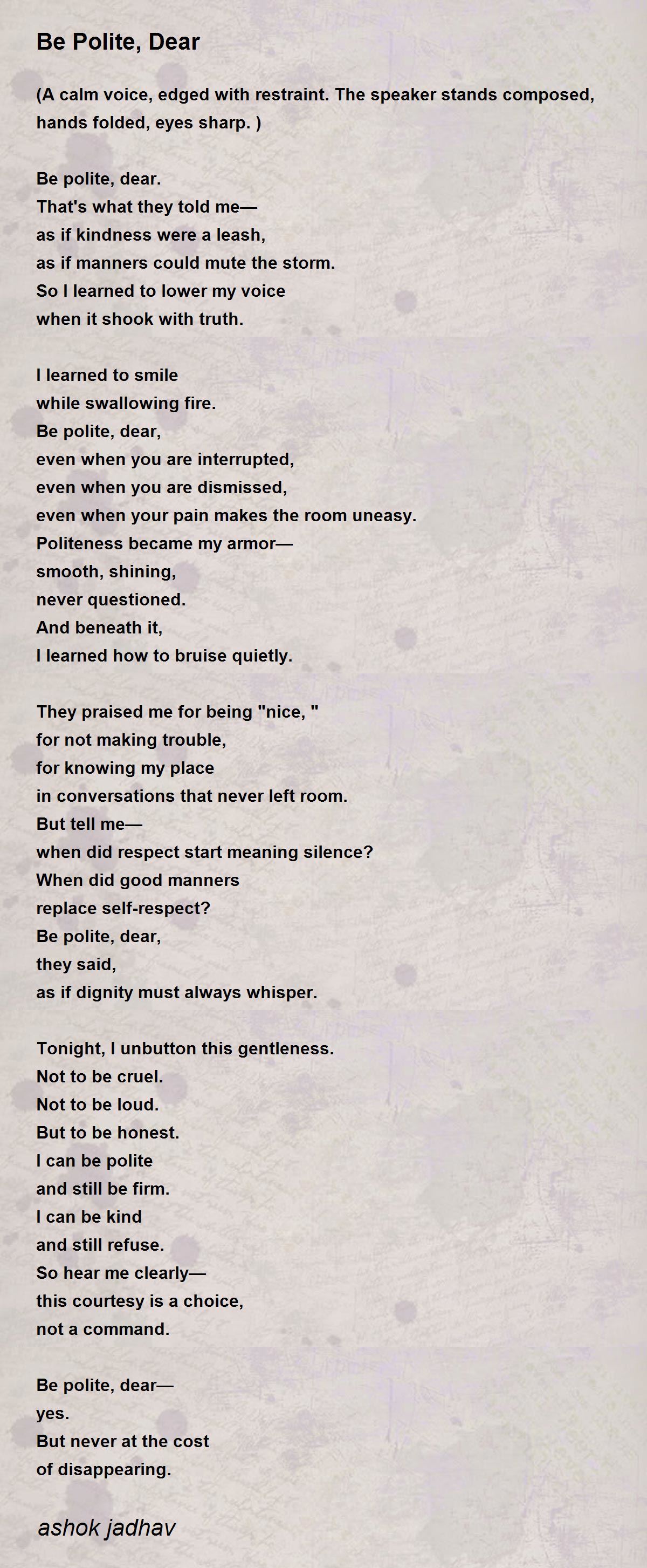 (A calm voice, edged with restraint. The speaker stands composed, hands folded, eyes sharp.)