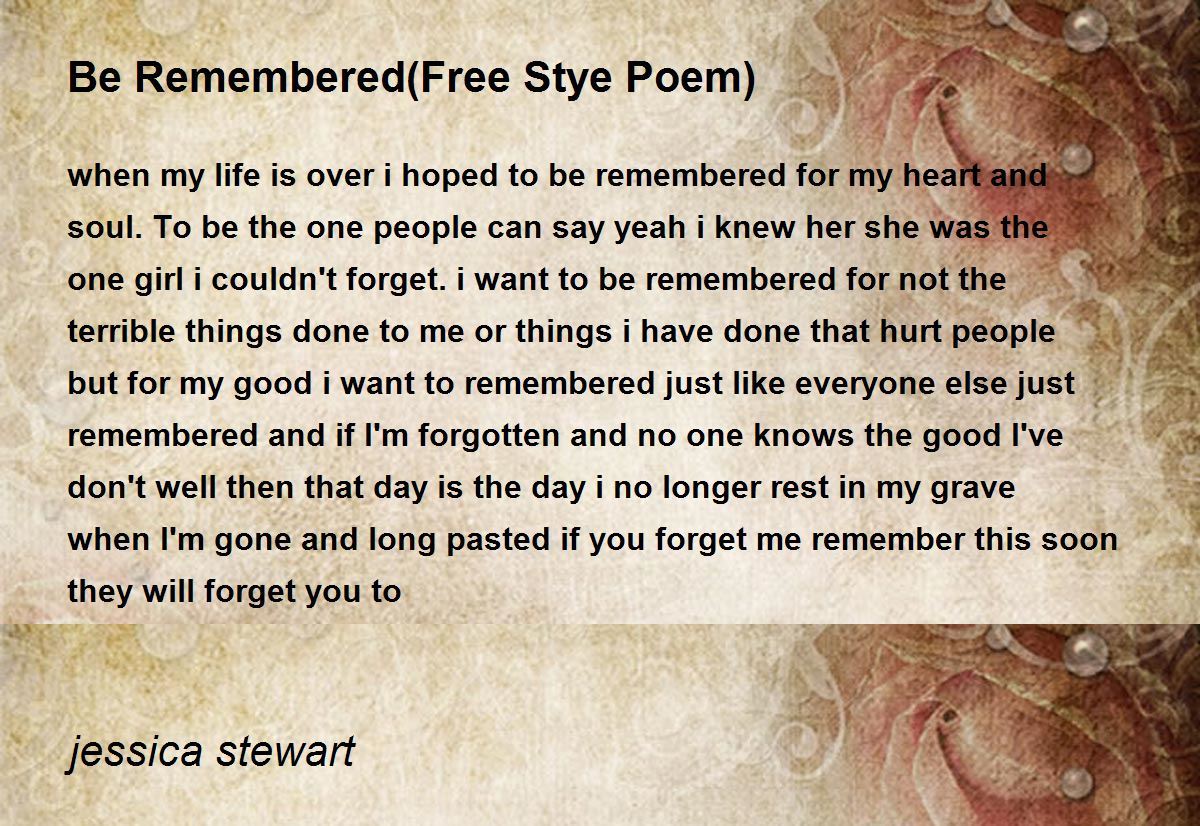 when my life is over i hoped to be remembered for my heart and soul. To be the one people can say yeah i knew her she was the one girl i couldn't forget. i want to be remembered for not the terrible things done to me or things i have done that hurt people but for my good i want to remembered just like everyone else just remembered and if I'm forgotten and no one knows the good I've don't well then that day is the day i no longer rest in my grave when I'm gone and long pasted if you forget me remember this soon they will forget you to