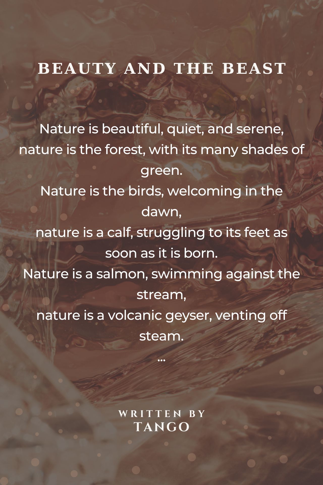 I enjoyed this poem with it's comparison of nature being both beauty & beast at times. Thanks for sharing. Ravensong