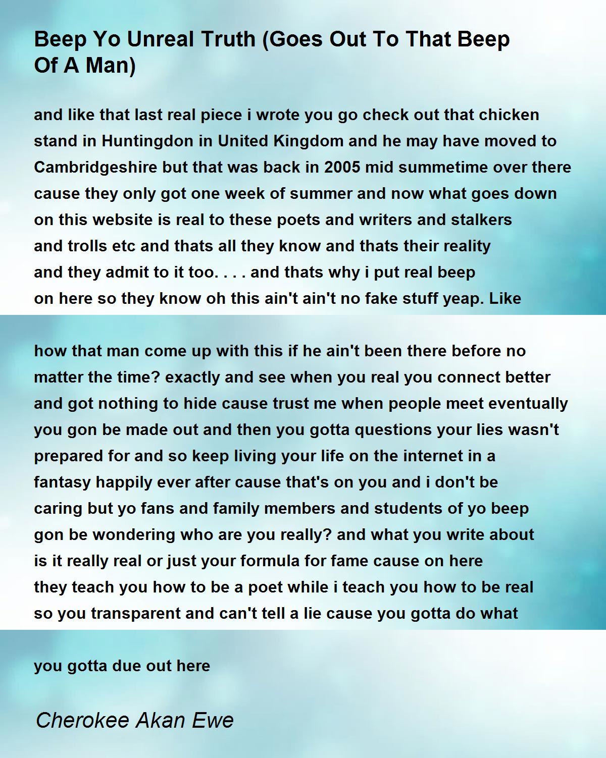 and like that last real piece i wrote you go check out that chicken stand in Huntingdon in United Kingdom and he may have moved to Cambridgeshire but that was back in 2005 mid summetime over there cause they only got one week of summer and now what goes down on this website is real to these poets and writers and stalkers and trolls etc and thats all they know and thats their reality and they admit to it too....and thats why i put real beep on here so they know oh this ain't ain't no fake stuff yeap. Like how that man come up with this if he ain't been there before no matter the time? exactly and see when you real you connect better and got nothing to hide cause trust me when people meet eventually you gon be made out and then you gotta questions your lies wasn't prepared for and so keep living your life on the internet in a fantasy happily ever after cause that's on you and i don't be caring but yo fans and family members and students of yo beep gon be wondering who are you really? and what you write about is it really real or just your formula for fame cause on here they teach you how to be a poet while i teach you how to be real so you transparent and can't tell a lie cause you gotta do what you gotta due out here