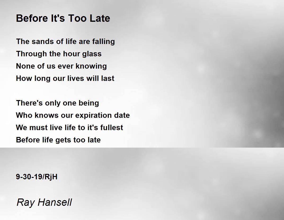 Before life makes us late. Excellent poem on not knowing when But knowing. James McLain 🎸
