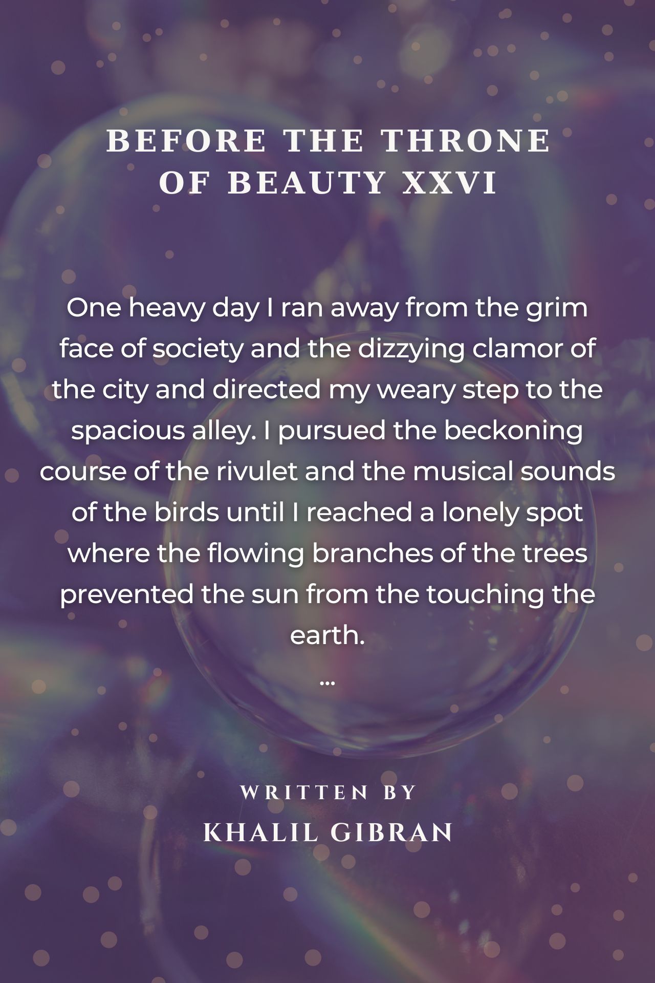 After a deep silence, mingled with sweet dreams, I asked, 'Speak to me of that beauty which the people interpret and define, each one according to his own conception; I have seen her honored and worshipped in different ways and manners.'