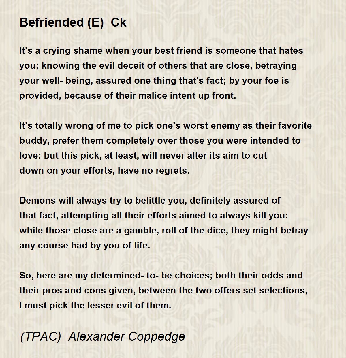 It's a crying shame when your best friend is someone that hates you; knowing the evil deceit of others that are close, betraying your well-being, assured one thing that's fact; by your foe is provided, because of their malice intent up front.