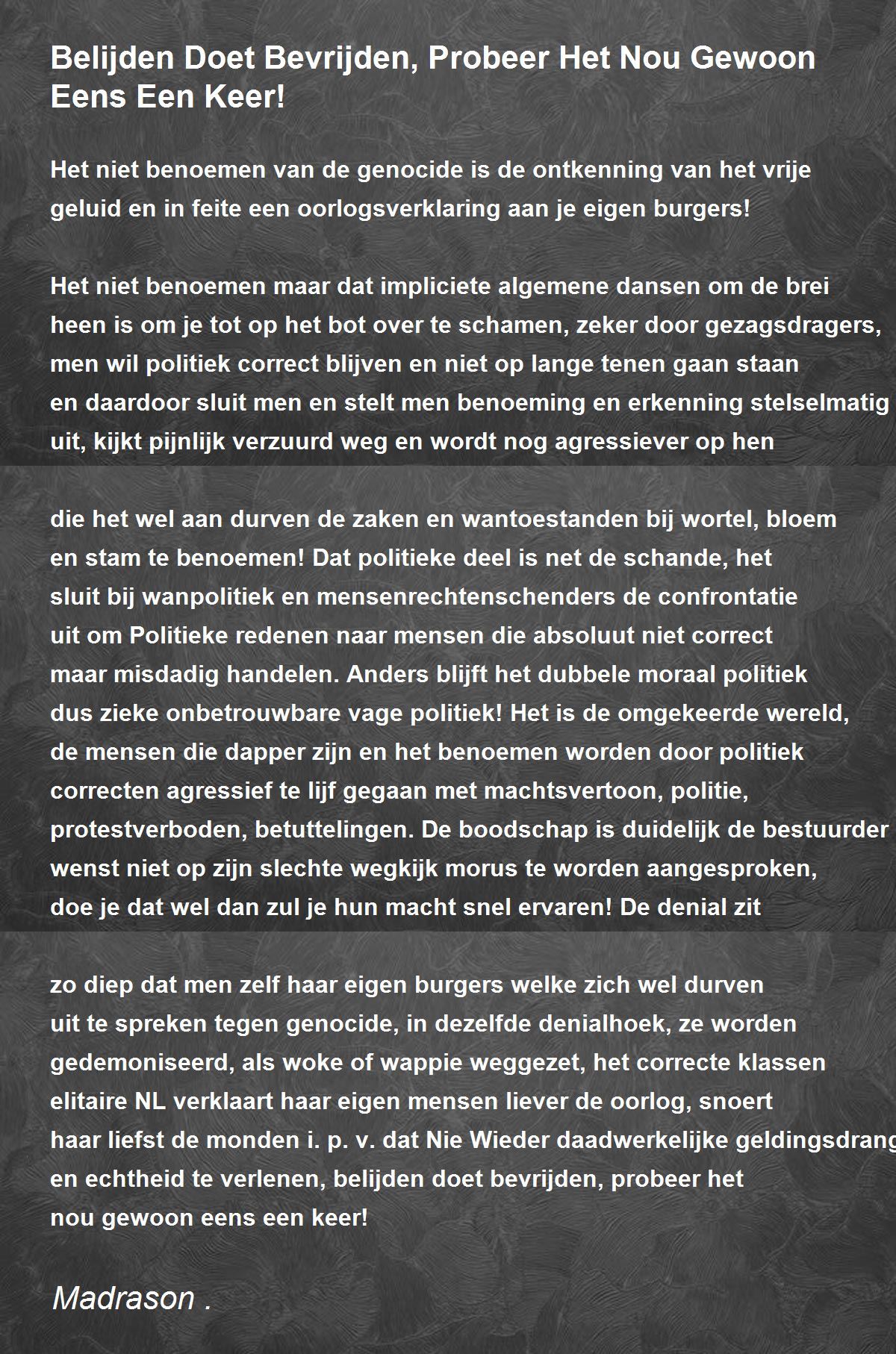 Het niet benoemen maar dat impliciete algemene dansen om de brei heen is om je tot op het bot over te schamen, zeker door gezagsdragers, men wil politiek correct blijven en niet op lange tenen gaan staan en daardoor sluit men en stelt men benoeming en erkenning stelselmatig uit, kijkt pijnlijk verzuurd weg en wordt nog agressiever op hen die het wel aan durven de zaken en wantoestanden bij wortel, bloem en stam te benoemen! Dat politieke deel is net de schande, het sluit bij wanpolitiek en mensenrechtenschenders de confrontatie uit om Politieke redenen naar mensen die absoluut niet correct maar misdadig handelen. Anders blijft het dubbele moraal politiek dus zieke onbetrouwbare vage politiek! Het is de omgekeerde wereld, de mensen die dapper zijn en het benoemen worden door politiek correcten agressief te lijf gegaan met machtsvertoon, politie, protestverboden, betuttelingen. De boodschap is duidelijk de bestuurder wenst niet op zijn slechte wegkijk morus te worden aangesproken, doe je dat wel dan zul je hun macht snel ervaren! De denial zit zo diep dat men zelf haar eigen burgers welke zich wel durven uit te spreken tegen genocide, in dezelfde denialhoek, ze worden gedemoniseerd, als woke of wappie weggezet, het correcte klassen elitaire NL verklaart haar eigen mensen liever de oorlog, snoert haar liefst de monden i.p.v. dat Nie Wieder daadwerkelijke geldingsdrang en echtheid te verlenen, belijden doet bevrijden, probeer het nou gewoon eens een keer!