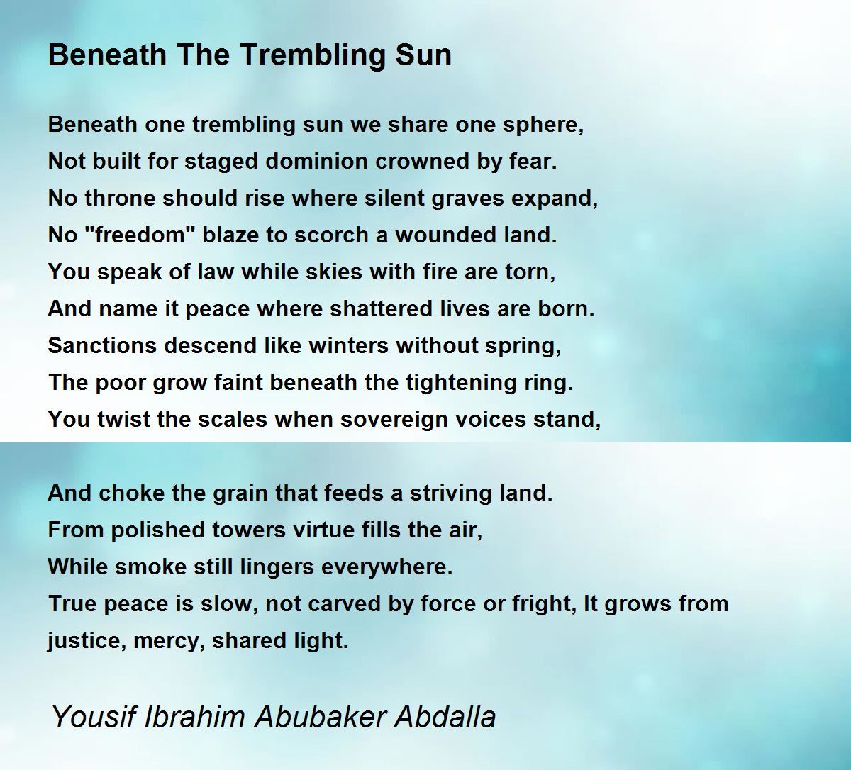 Beneath one trembling sun we share one sphere,