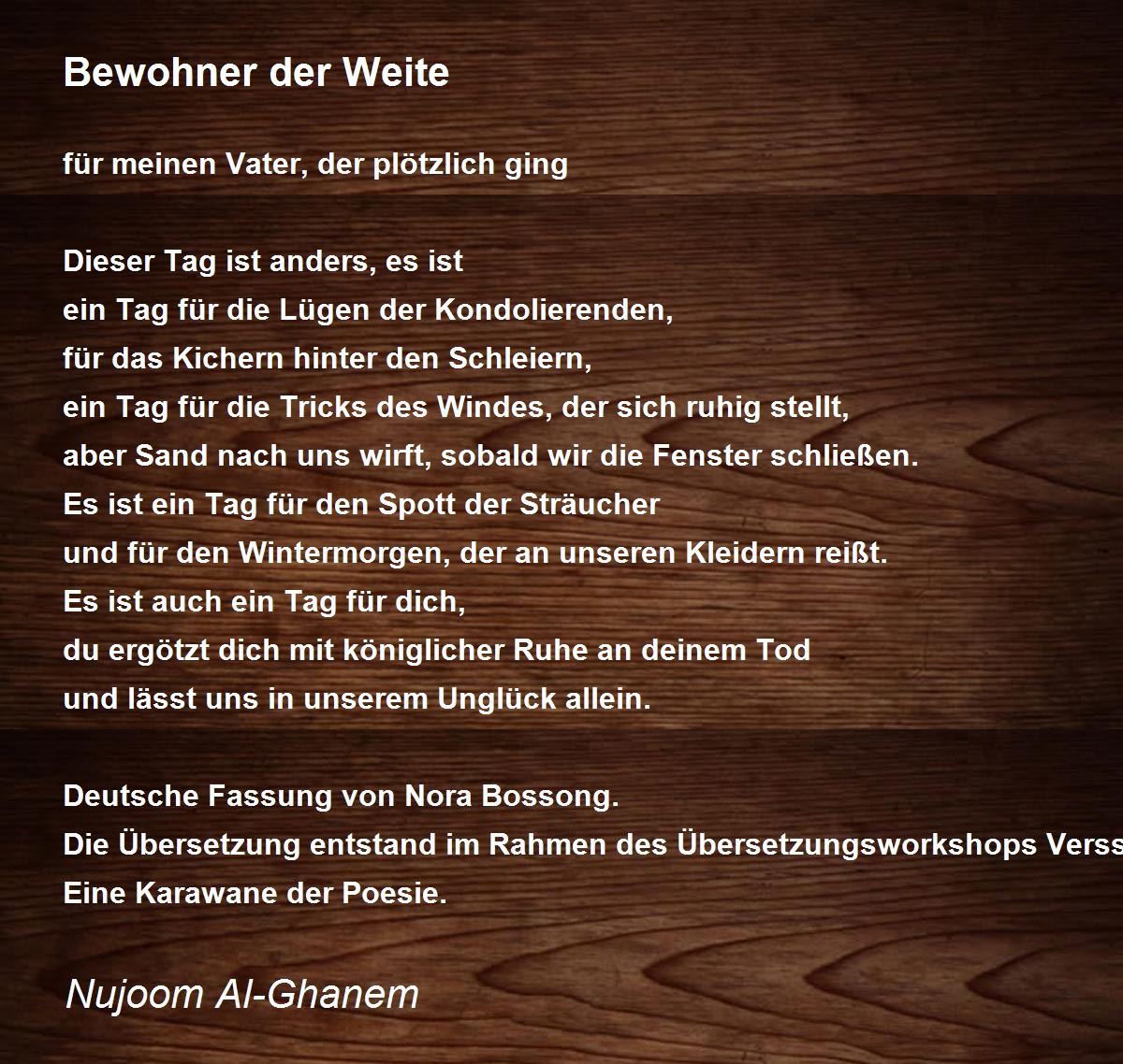 Die Übersetzung entstand im Rahmen des Übersetzungsworkshops Versschmuggel. Eine Karawane der Poesie.