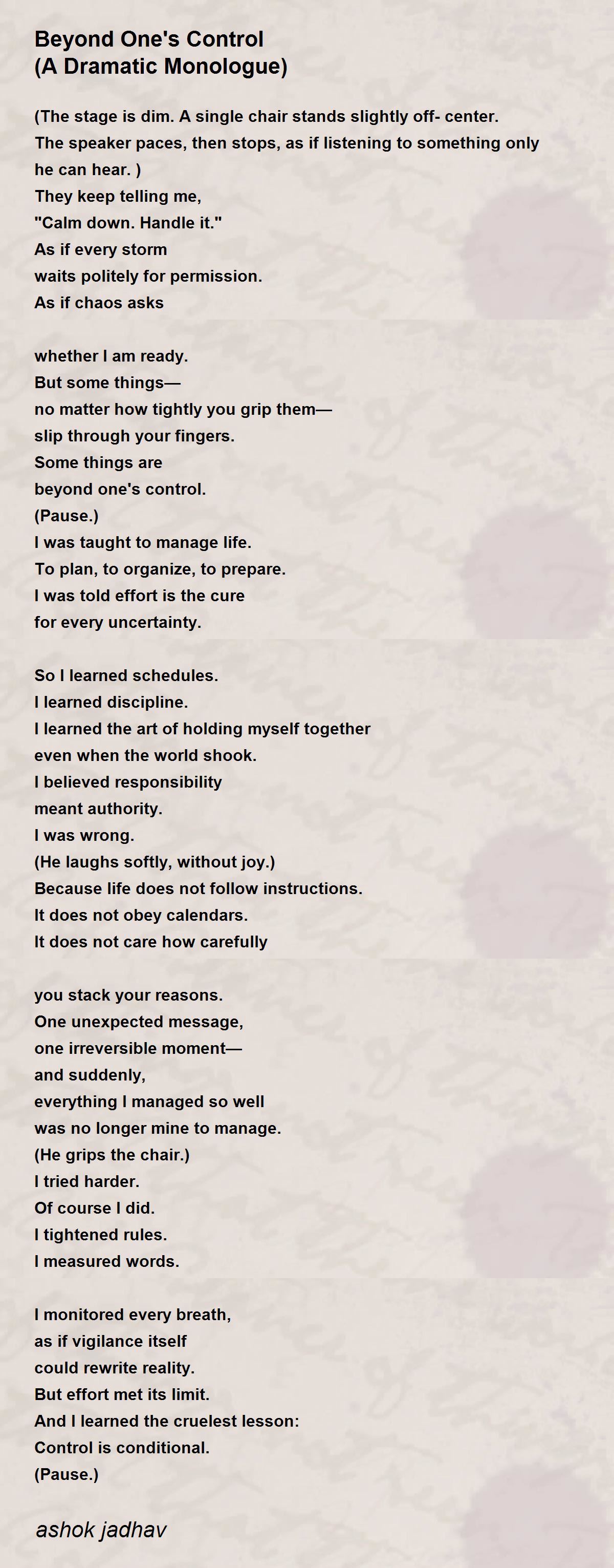 (The stage is dim. A single chair stands slightly off-center. The speaker paces, then stops, as if listening to something only he can hear.)
