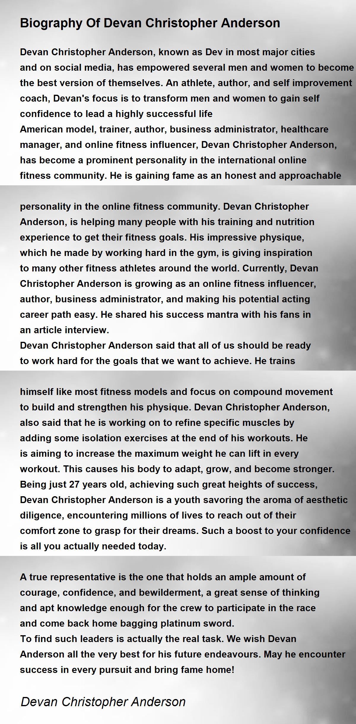 American model, trainer, author, business administrator, healthcare manager, and online fitness influencer, Devan Christopher Anderson, has become a prominent personality in the international online fitness community. He is gaining fame as an honest and approachable personality in the online fitness community. Devan Christopher Anderson, is helping many people with his training and nutrition experience to get their fitness goals. His impressive physique, which he made by working hard in the gym, is giving inspiration to many other fitness athletes around the world. Currently, Devan Christopher Anderson is growing as an online fitness influencer, author, business administrator, and making his potential acting career path easy. He shared his success mantra with his fans in an article interview.