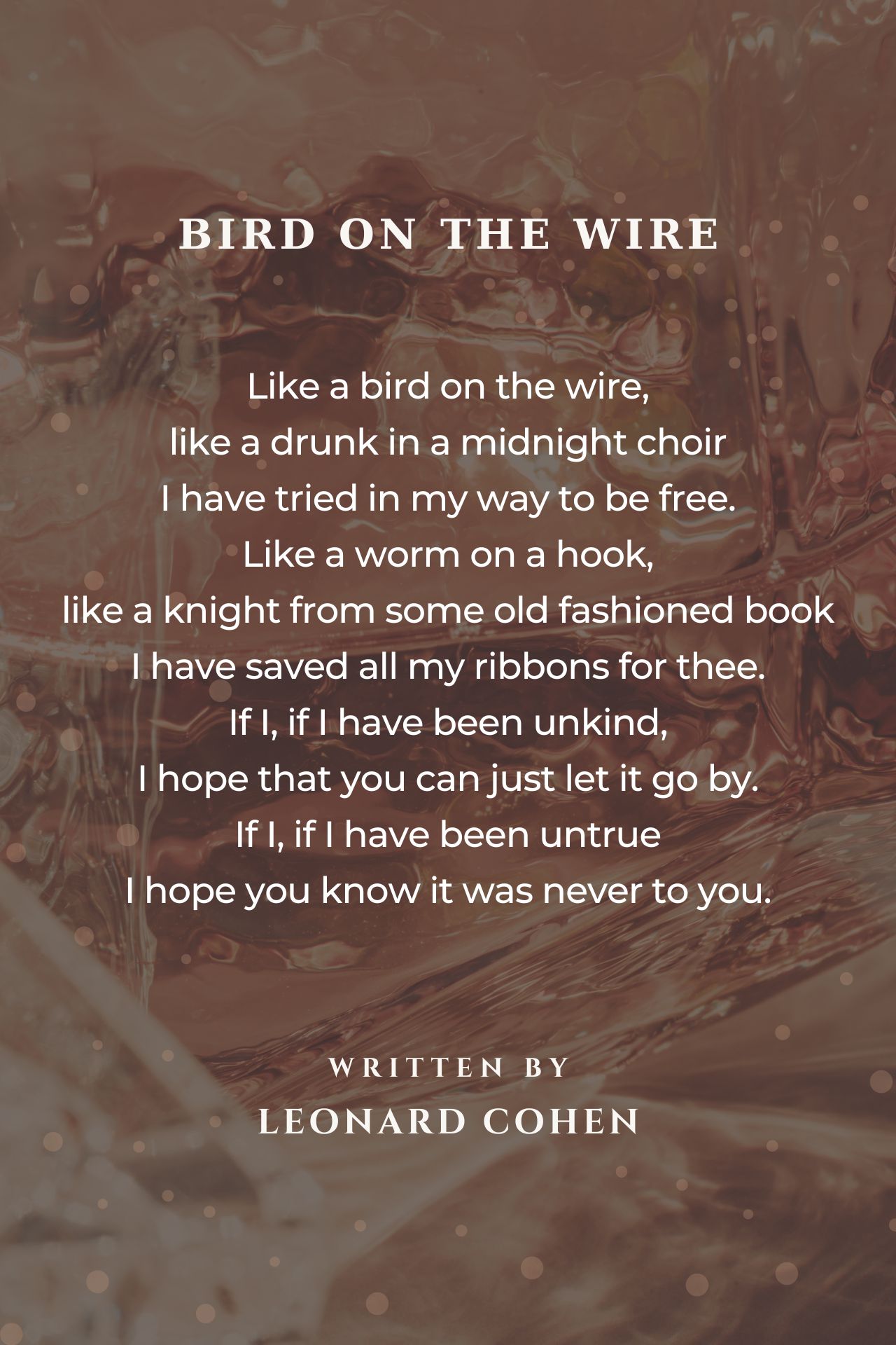 FULL TEXT: __________ ''Bird On The Wire'' Like a bird on the wire, like a drunk in a midnight choir I have tried in my way to be free. Like a worm on a hook, like a knight from some old fashioned book I have saved all my ribbons for thee. If I, if I have been unkind, I hope that you can just let it go by. If I, if I have been untrue I hope you know it was never to you. Like a baby, stillborn, like a beast with his horn I have torn everyone who reached out for me. But I swear by this song and by all that I have done wrong I will make it all up to thee. I saw a beggar leaning on his wooden crutch, he said to me, You must not ask for so much. And a pretty woman leaning in her darkened door, she cried to me, Hey, why not ask for more? Oh like a bird on the wire, like a drunk in a midnight choir I have tried in my way to be free. .