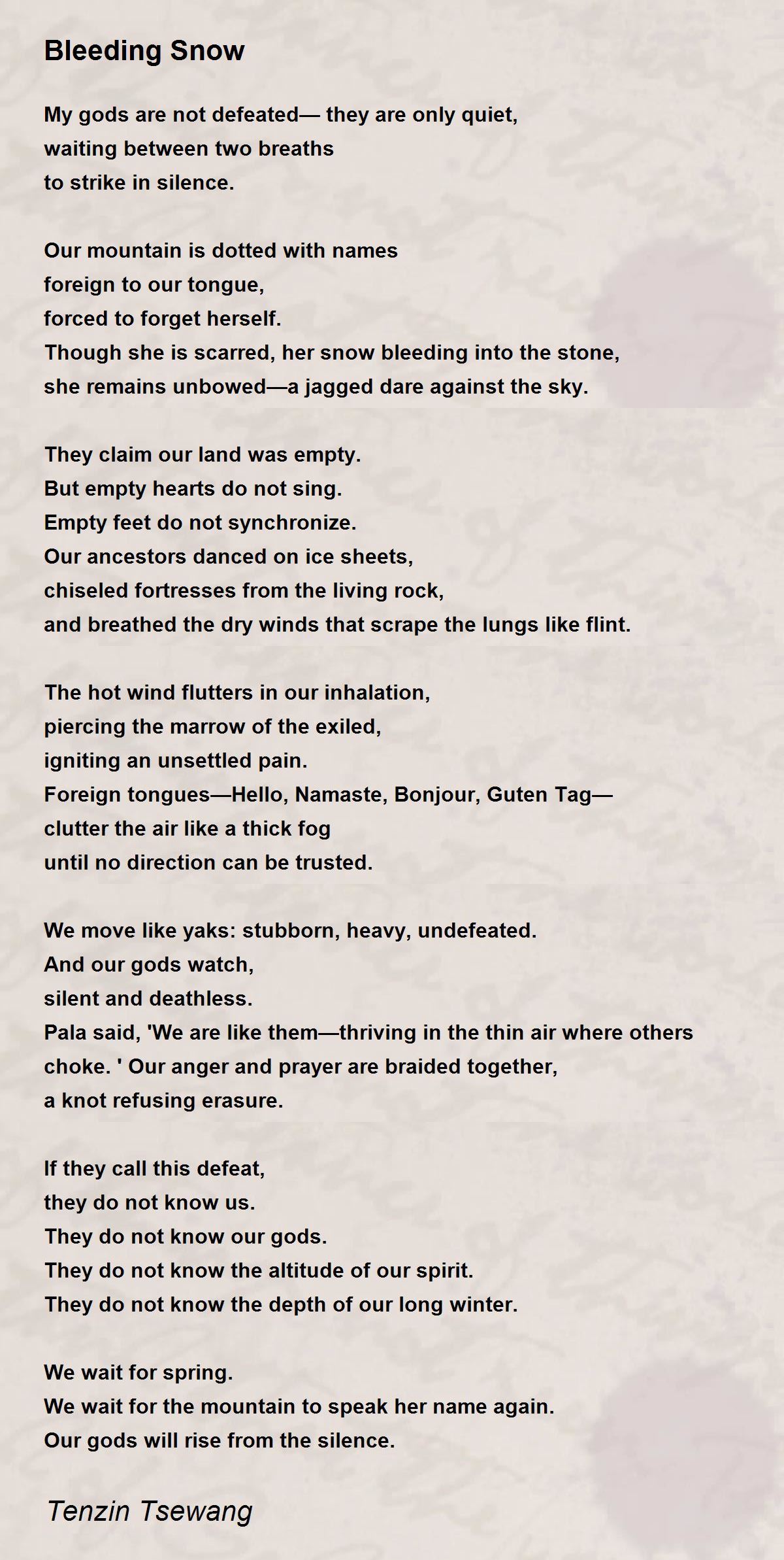 Though she is scarred, her snow bleeding into the stone,