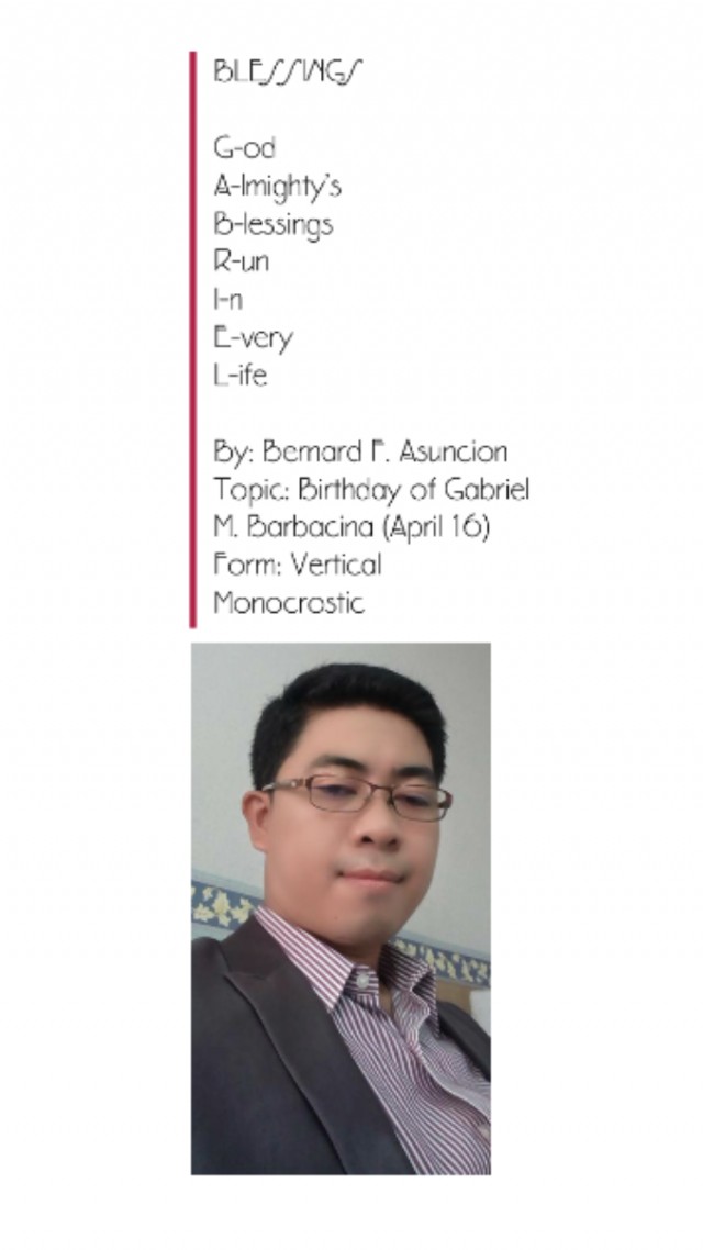Topic: Birthday of Gabriel M. Barbacina (April 16)