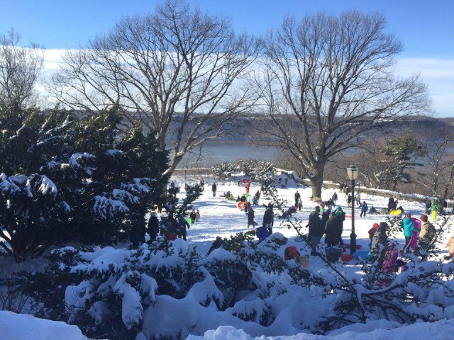 In snow covered Fort Tryon Park, they play