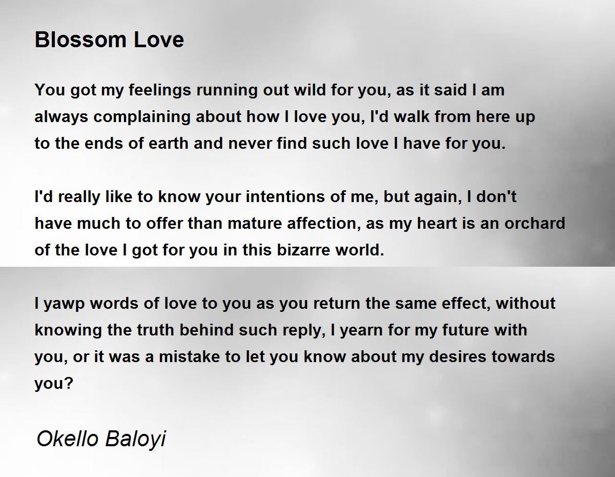 I'd really like to know your intentions of me, but again, I don't have much to offer than mature affection, as my heart is an orchard of the love I got for you in this bizarre world.