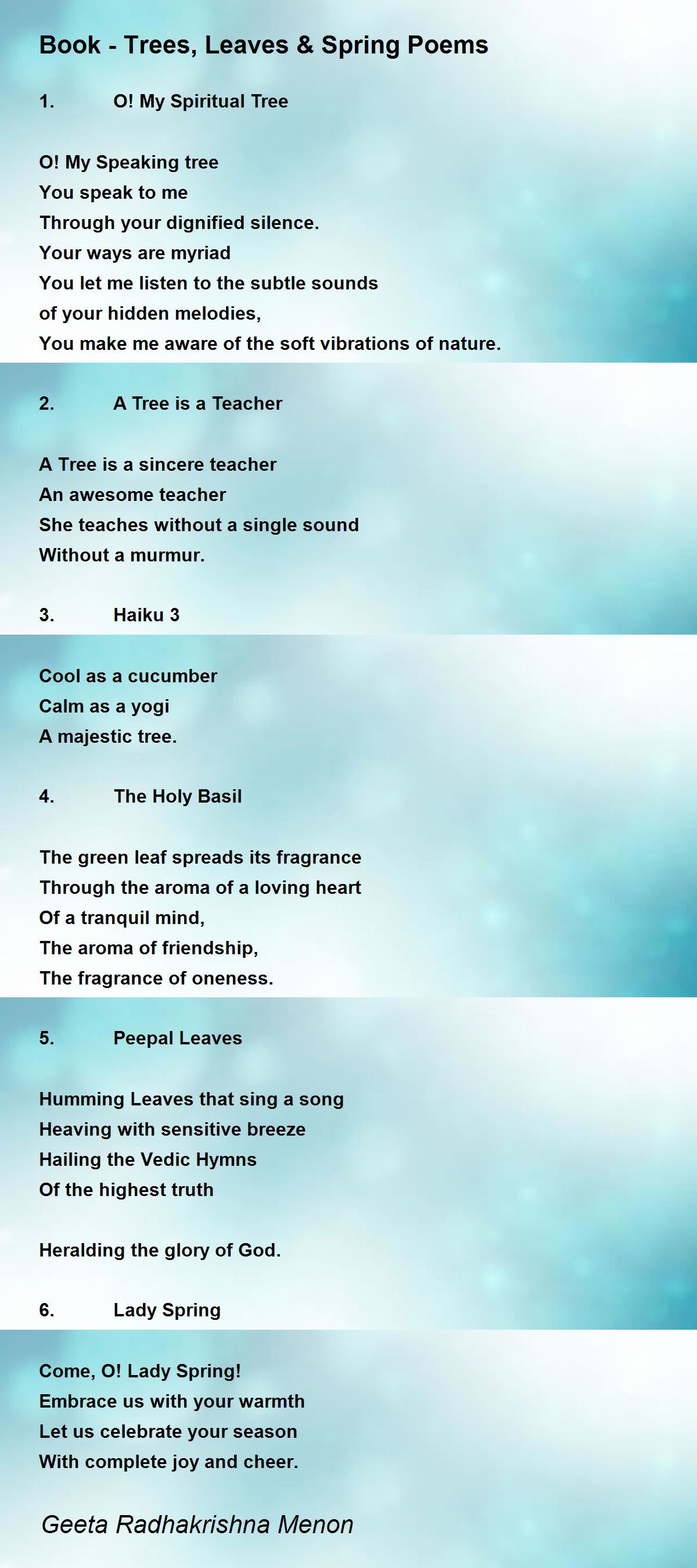 Beautiful poems woven in wonderful poetic forms. They express the very essence of Trees, leaves and the season of renewal.