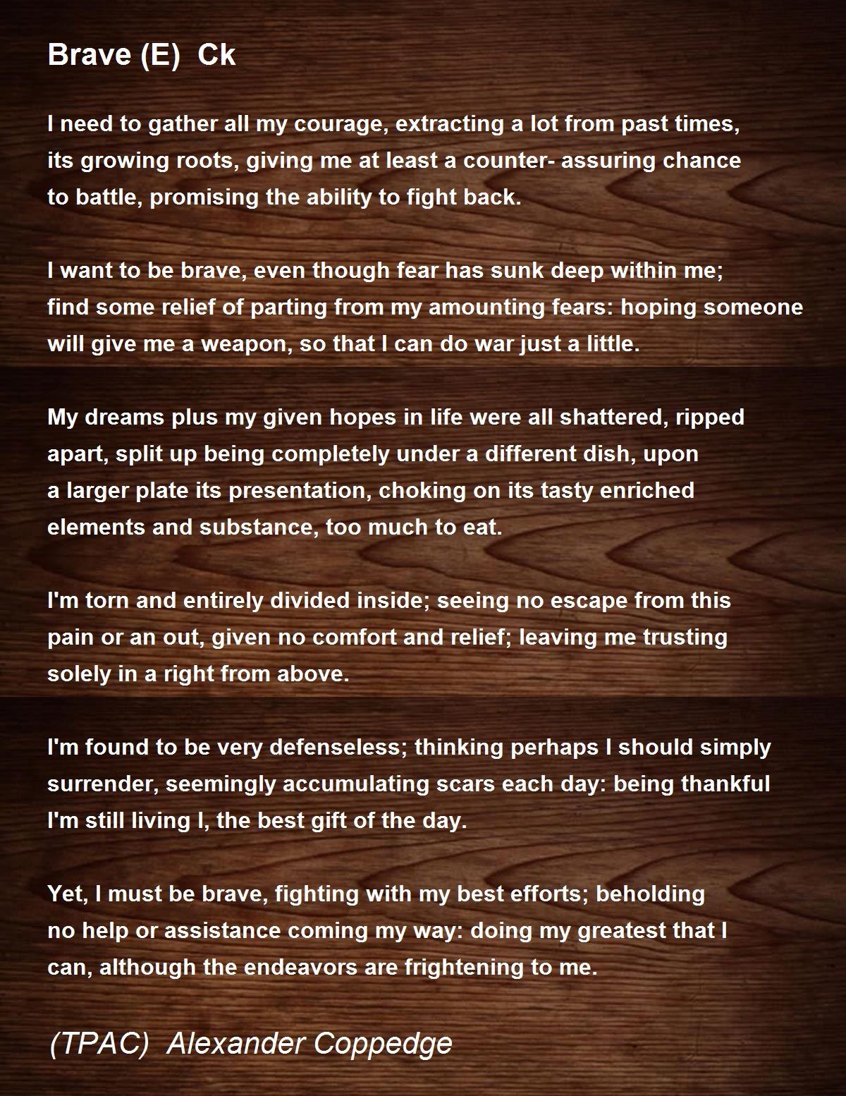 I want to be brave, even though fear has sunk deep within me; find some relief of parting from my amounting fears: hoping someone will give me a weapon, so that I can do war just a little.