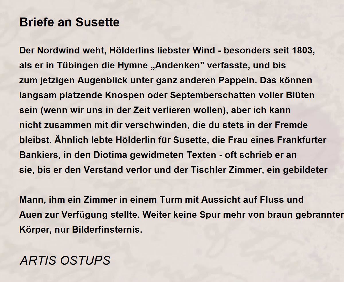 Der Nordwind weht, Hölderlins liebster Wind - besonders seit 1803, als er in Tübingen die Hymne „Andenken" verfasste, und bis zum jetzigen Augenblick unter ganz anderen Pappeln. Das können langsam platzende Knospen oder Septemberschatten voller Blüten sein (wenn wir uns in der Zeit verlieren wollen), aber ich kann nicht zusammen mit dir verschwinden, die du stets in der Fremde bleibst. Ähnlich lebte Hölderlin für Susette, die Frau eines Frankfurter Bankiers, in den Diotima gewidmeten Texten - oft schrieb er an sie, bis er den Verstand verlor und der Tischler Zimmer, ein gebildeter Mann, ihm ein Zimmer in einem Turm mit Aussicht auf Fluss und Auen zur Verfügung stellte. Weiter keine Spur mehr von braun gebranntem Körper, nur Bilderfinsternis.