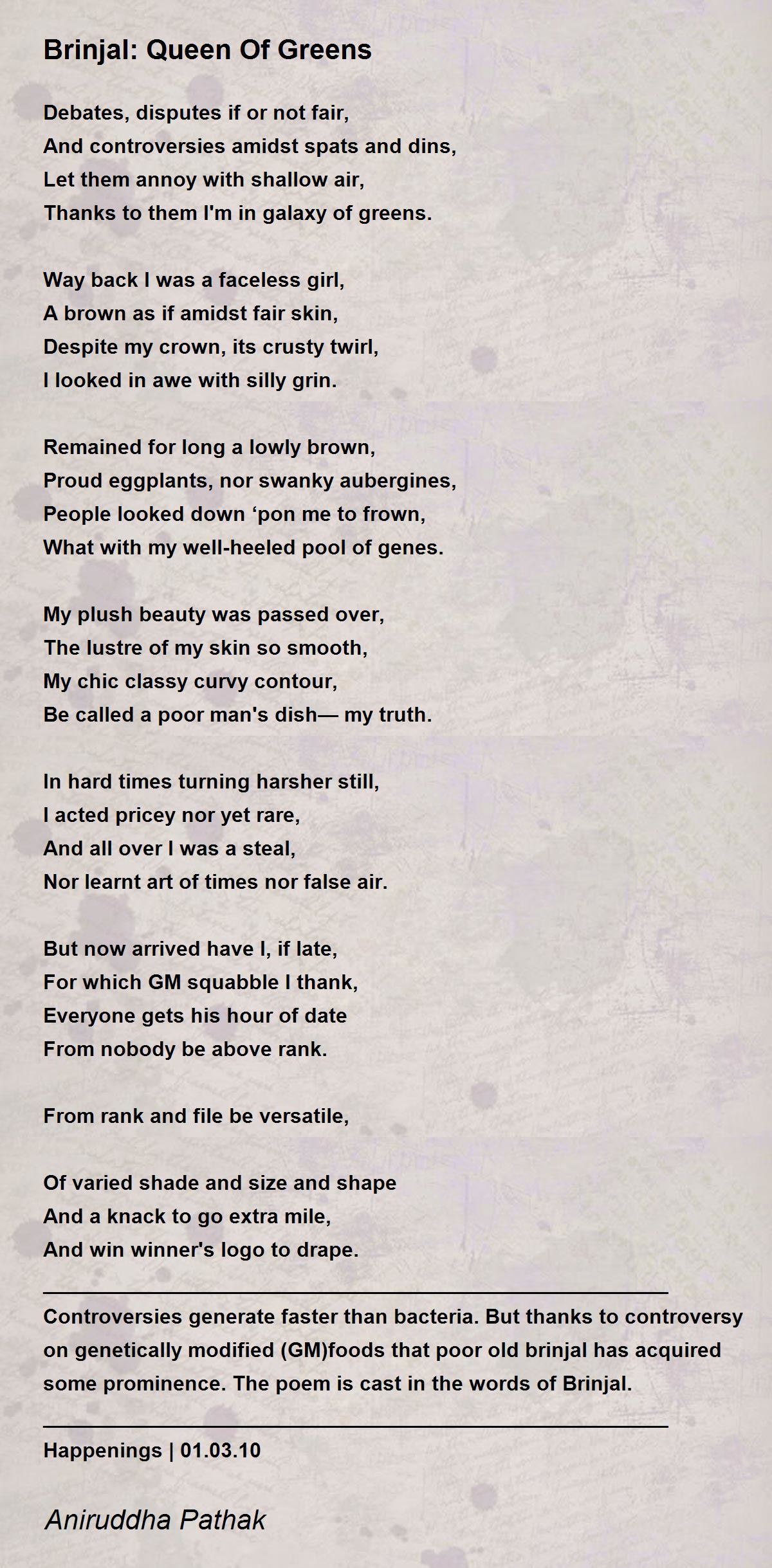 Controversies generate faster than bacteria. But thanks to controversy on genetically modified (GM)foods that poor old brinjal has acquired some prominence. The poem is cast in the words of Brinjal.