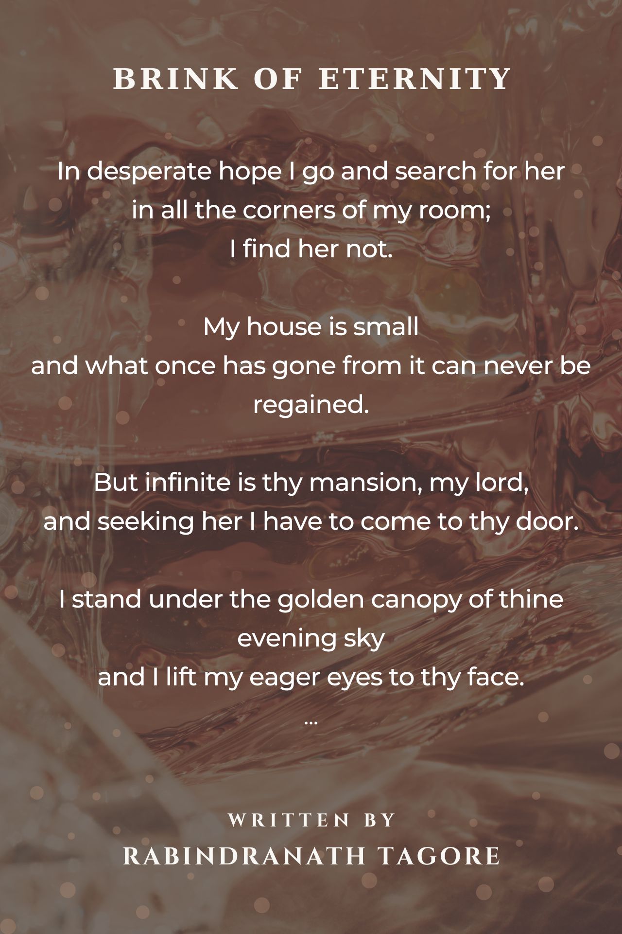 A poem conveying all the spiritual elements. We are all in search of eternity but often haven't the glimpse of it. God is eternal and so, eternity goes with god. Eternity means ever continuous and non-perishable. 'Let me for once feel that lost sweet touch '- this line conveys a lot. It reflects one thing in essential - 'lost touch'- the grace that the poet received in his previous births. He longs for that.
