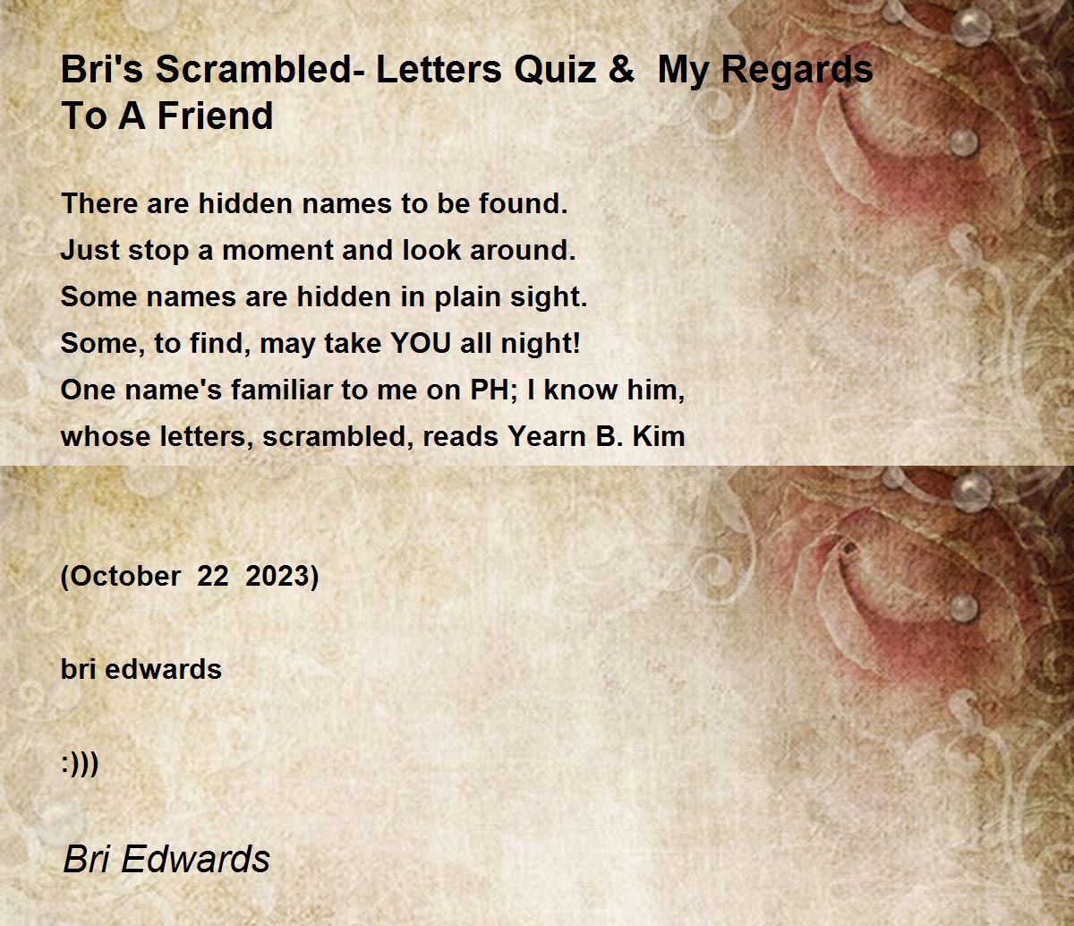 AND NOW Belle Wassermeister aka Belle Ringer has a poem about a 'scrambled name', with lots of hints. ;) bri