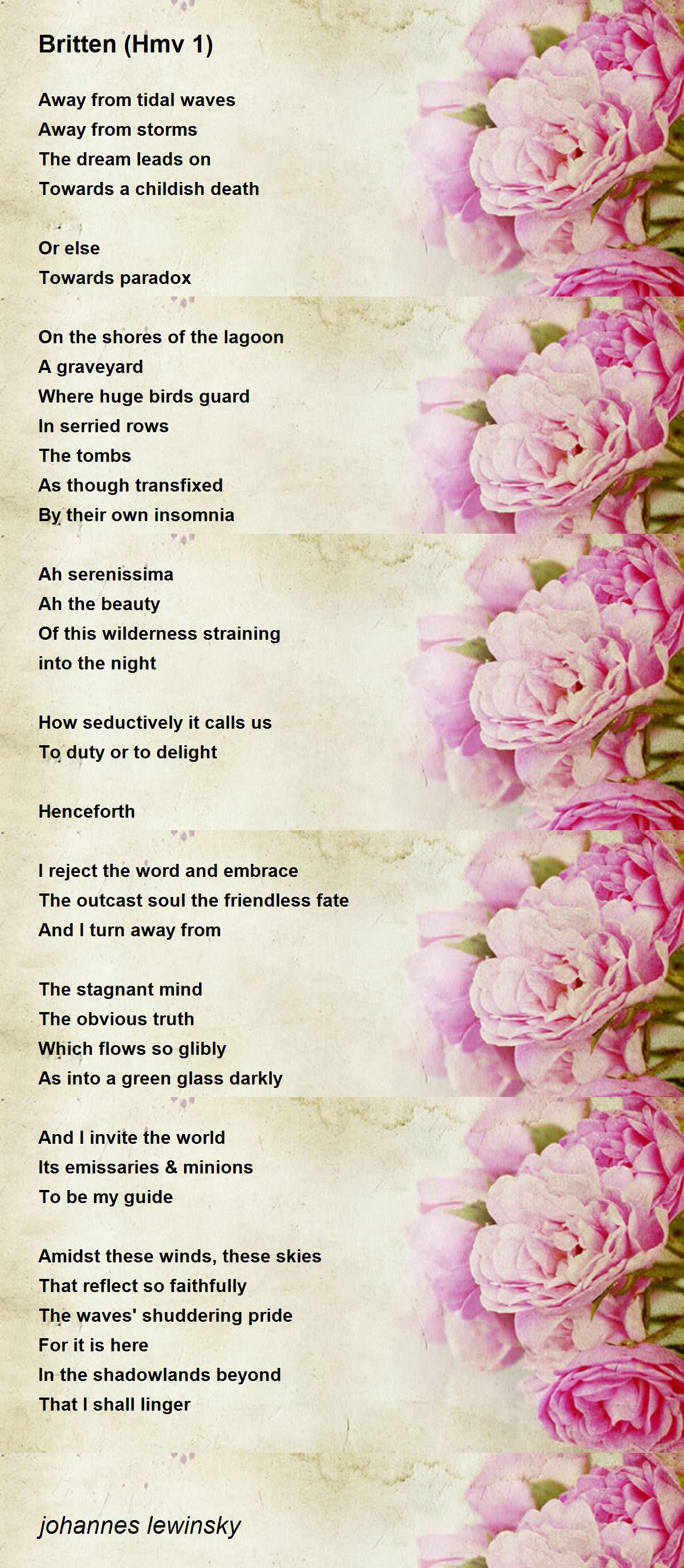 The axis of this poem is the space between Britten's first and last operas Peter Grimes and ‘Death in Venice' with their wildly divergent landscapes as background to remarkably similar monodramas.