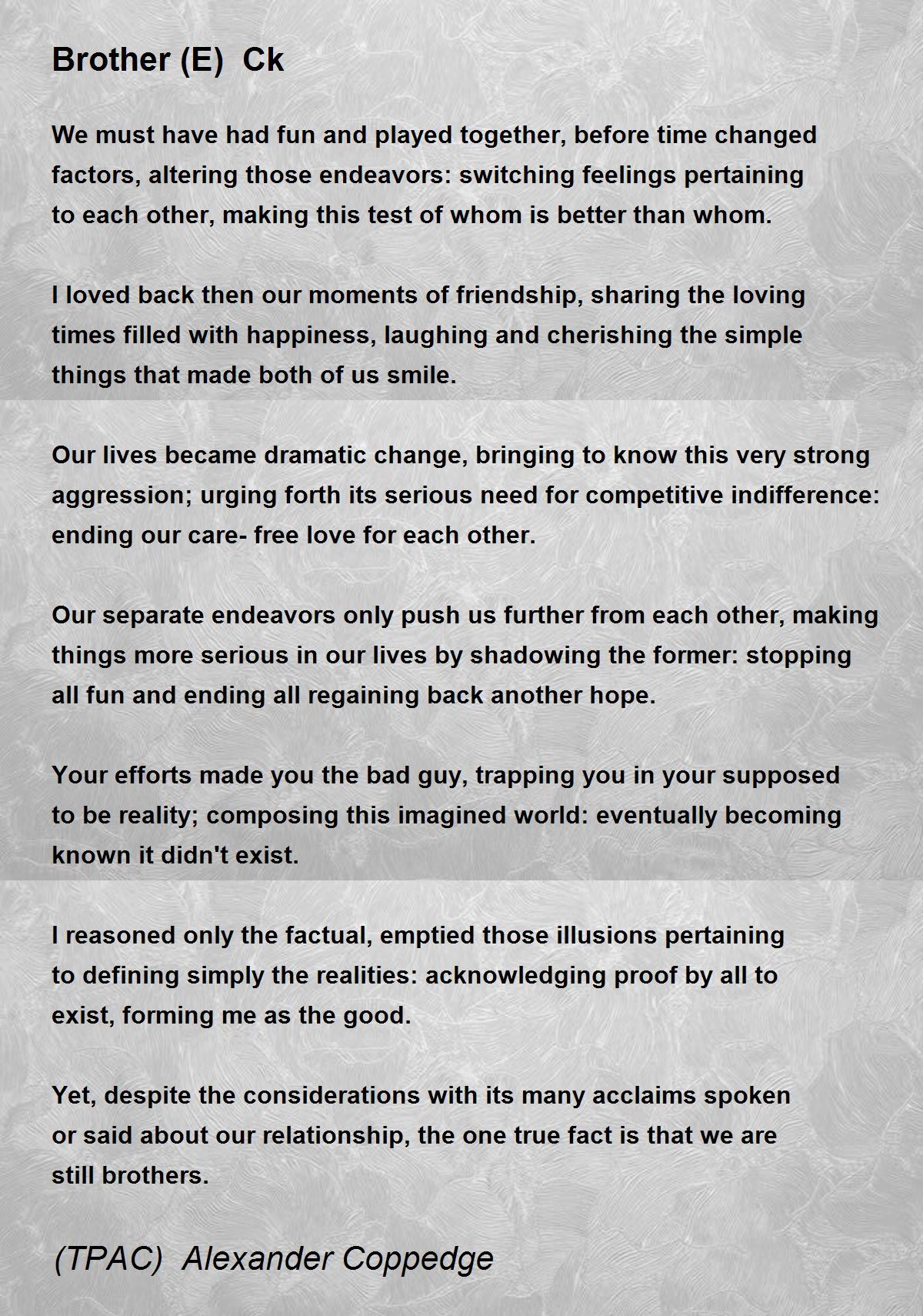 We must have had fun and played together, before time changed factors, altering those endeavors: switching feelings pertaining to each other, making this test of whom is better than whom.