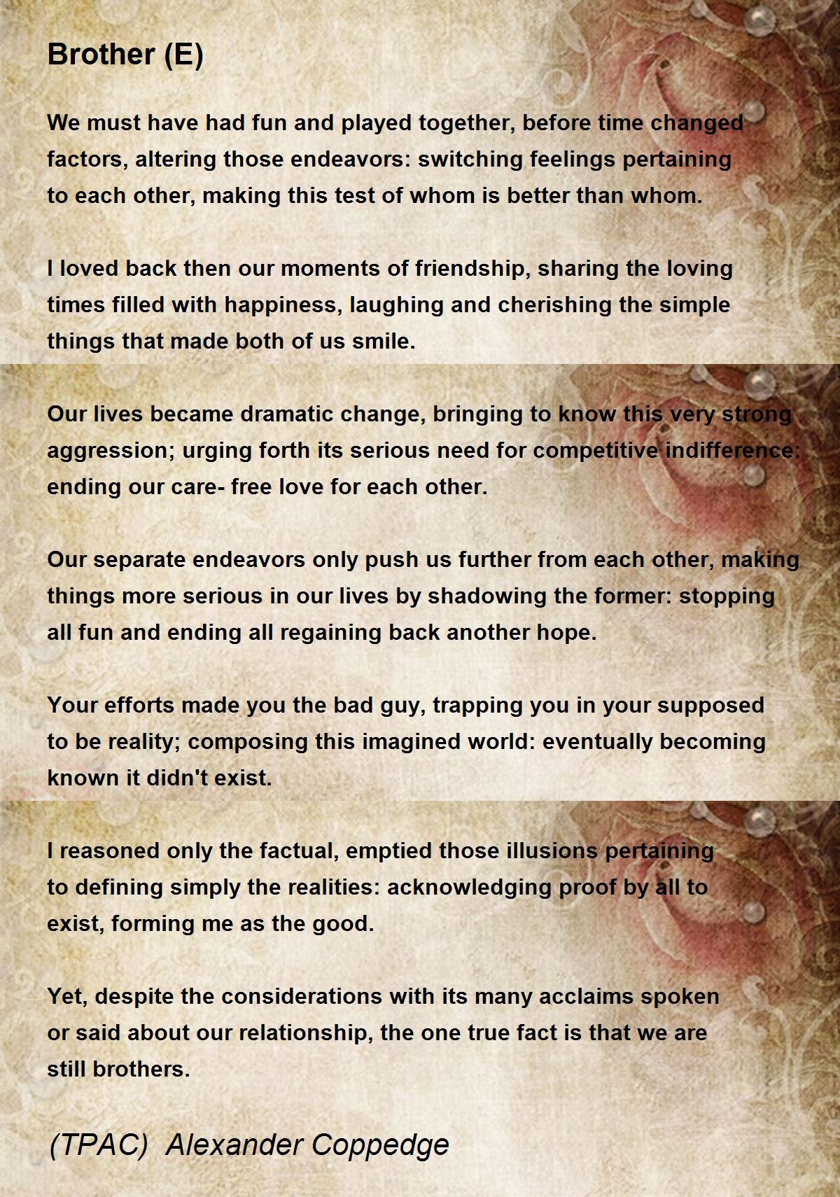 We must have had fun and played together, before time changed factors, altering those endeavors: switching feelings pertaining to each other, making this test of whom is better than whom.