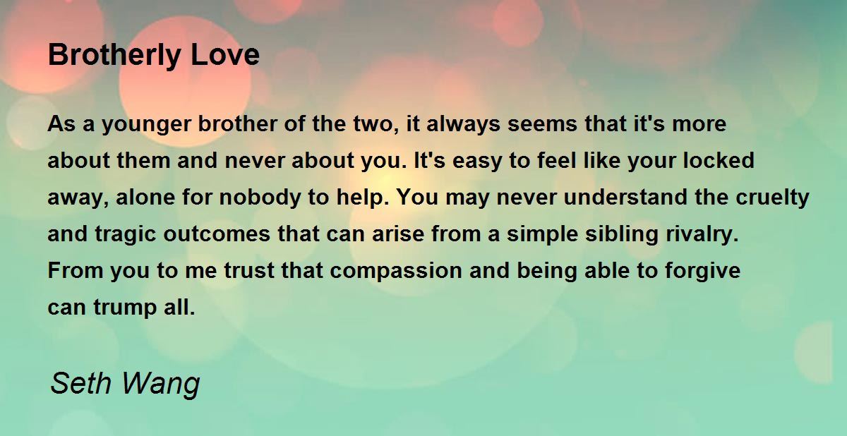 As a younger brother of the two, it always seems that it's more about them and never about you. It's easy to feel like your locked away, alone for nobody to help. You may never understand the cruelty and tragic outcomes that can arise from a simple sibling rivalry. From you to me trust that compassion and being able to forgive can trump all.
