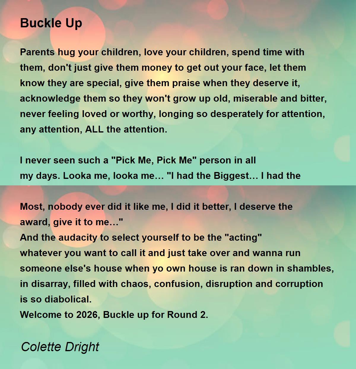 Parents hug your children, love your children, spend time with them, don't just give them money to get out your face, let them know they are special, give them praise when they deserve it, acknowledge them so they won't grow up old, miserable and bitter, never feeling loved or worthy, longing so desperately for attention, any attention, ALL the attention.