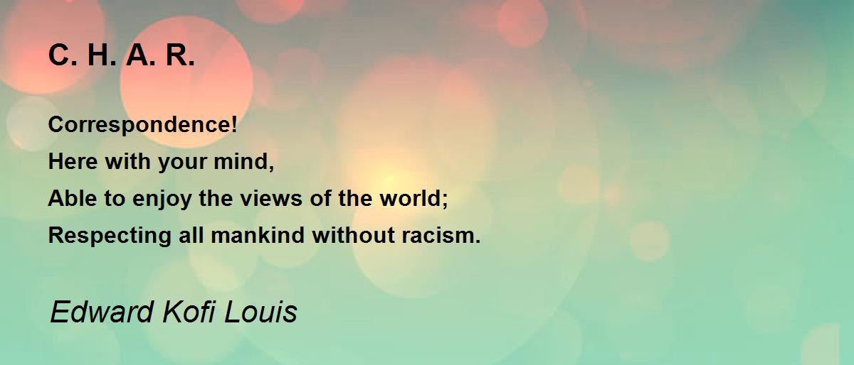 Correspondence! Here with your mind, Able to enjoy the views of the world; Respecting all mankind without racism.