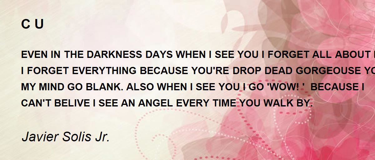 EVEN IN THE DARKNESS DAYS WHEN I SEE YOU I FORGET ALL ABOUT IT. I FORGET EVERYTHING BECAUSE YOU'RE DROP DEAD GORGEOUSE YOU MAKE MY MIND GO BLANK. ALSO WHEN I SEE YOU I GO 'WOW! ' BECAUSE I CAN'T BELIVE I SEE AN ANGEL EVERY TIME YOU WALK BY.