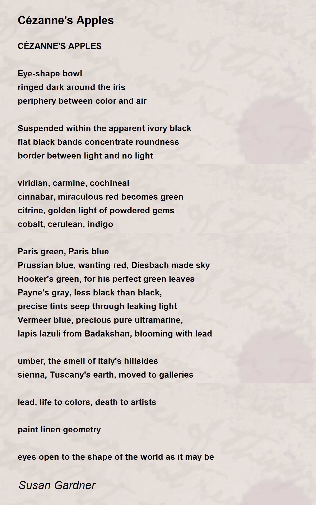 I love the paintings of Paul Cézanne, and he was famous for his apple paintings. You have done a magnificent job of describing his painting here with your well-chosen words. Congratulations!