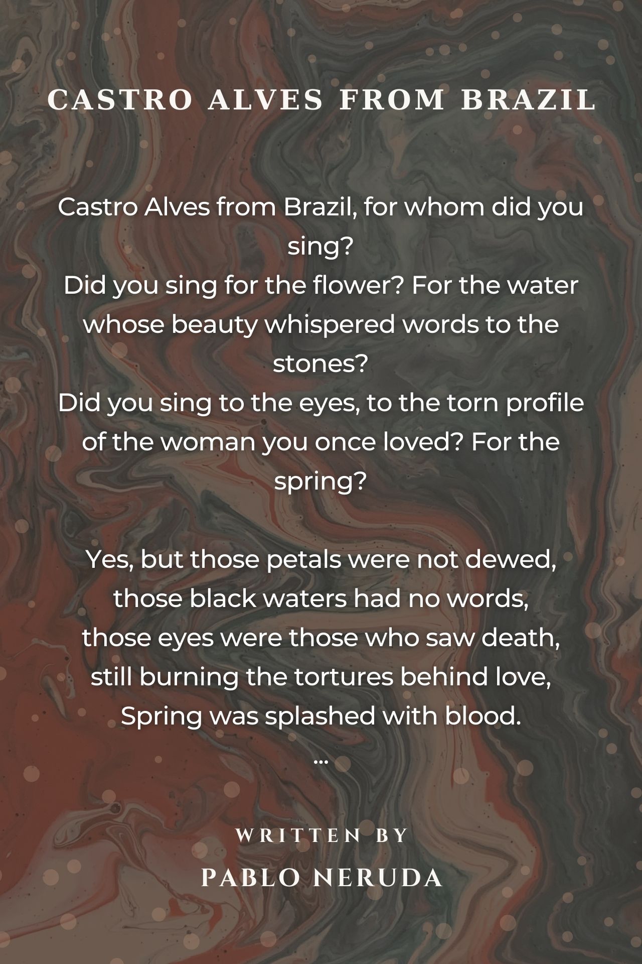 very sweet to the ears, especially; Castro Alves from Brazil, now that your pure book is reborn to a free land, let me, poet of our America, to crown your head with the laurels of the people. Your voice joined the eternal and loud voice of the men. You sang well. You sang how it must be sung. Pablo Neruda