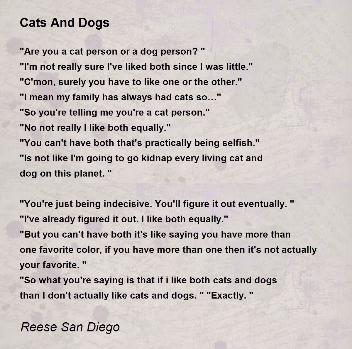 "So what you're saying is that if i like both cats and dogs than I don't actually like cats and dogs." "Exactly."