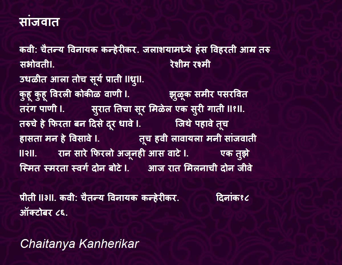 कवी: चैतन्य विनायक कन्हेरीकर. जलाशयामध्ये हंस विहरती आम्र तरु सभोवतीl. रेशीम रश्मी उधळीत आला तोच सूर्य प्राती llध्रुll. कुहू कुहू विरली कोकीळ वाणी l. झुळूक समीर पसरवित तरंग पाणी l. सुरात तिचा सूर मिळेल एक सुरी गाती ll१ll. तरुचे हे फिरता बन दिसे दूर धावे l. जिथे पहावे तूच हासता मन हे विसावे l. तूच हवी लावायला मनी सांजवाती ll२ll. रान सारे फिरलो अजूनही आस वाटे l. एक तुझे स्मित स्मरता स्वर्ग दोन बोटे l. आज रात मिलनाची दोन जीवे प्रीती ll३ll. कवी: चैतन्य विनायक कन्हेरीकर. दिनांक१८ ऑक्टोबर ८६.
