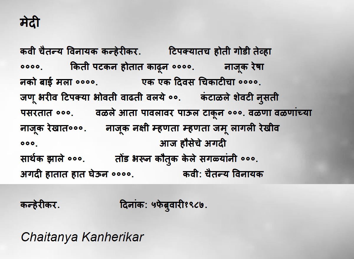 कवी चैतन्य विनायक कन्हेरीकर. टिपक्यातच होती गोडी तेव्हा ००००. किती पटकन होतात काढून ००००. नाजूक रेषा नको बाई मला ००००. एक एक दिवस चिकाटीचा ००००. जणू भरीव टिपक्या भोवती वाढती वलये ००. कंटाळले शेवटी नुसती पसरतात ०००. वळले आता पावलावर पाऊल टाकून ०००. वळणा वळणांच्या नाजूक रेखात०००. नाजूक नक्षी म्हणता म्हणता जमू लागली रेखीव ०००. आज हौसेचे अगदी सार्थक झाले ०००. तोंड भरून कौतुक केले सगळ्यांनी ०००. अगदी हातात हात घेऊन ००००. कवी: चैतन्य विनायक कन्हेरीकर. दिनांक: ५फेब्रुवारी१९८७.