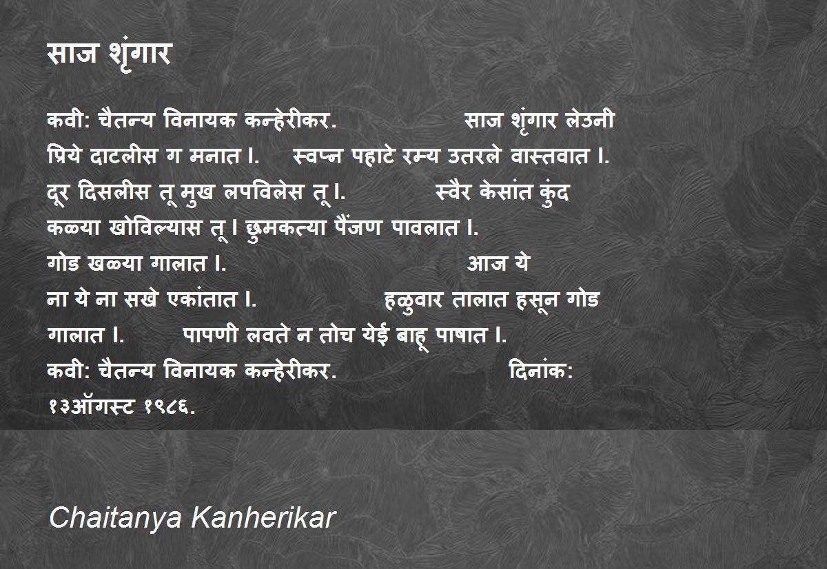 कवी: चैतन्य विनायक कन्हेरीकर. साज शृंगार लेउनी प्रिये दाटलीस ग मनात l. स्वप्न पहाटे रम्य उतरले वास्तवात l. दूर दिसलीस तू मुख लपविलेस तू l. स्वैर केसांत कुंद कळ्या खोविल्यास तू l छुमकत्या पैंजण पावलात l. गोड खळ्या गालात l. आज ये ना ये ना सखे एकांतात l. हळुवार तालात हसून गोड गालात l. पापणी लवते न तोच येई बाहू पाषात l. कवी: चैतन्य विनायक कन्हेरीकर. दिनांक: १३ऑगस्ट १९८६.