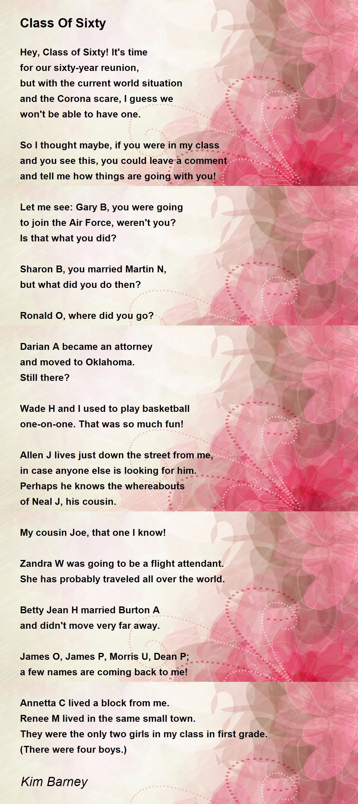 I doubt I will actually get a response from anyone in my class, since I don't suppose any of them are even on Poem Hunter. I should put something on Facebook instead. It amazes me that your husband's class has until recently been getting together every month! Most of them must still live nearby.