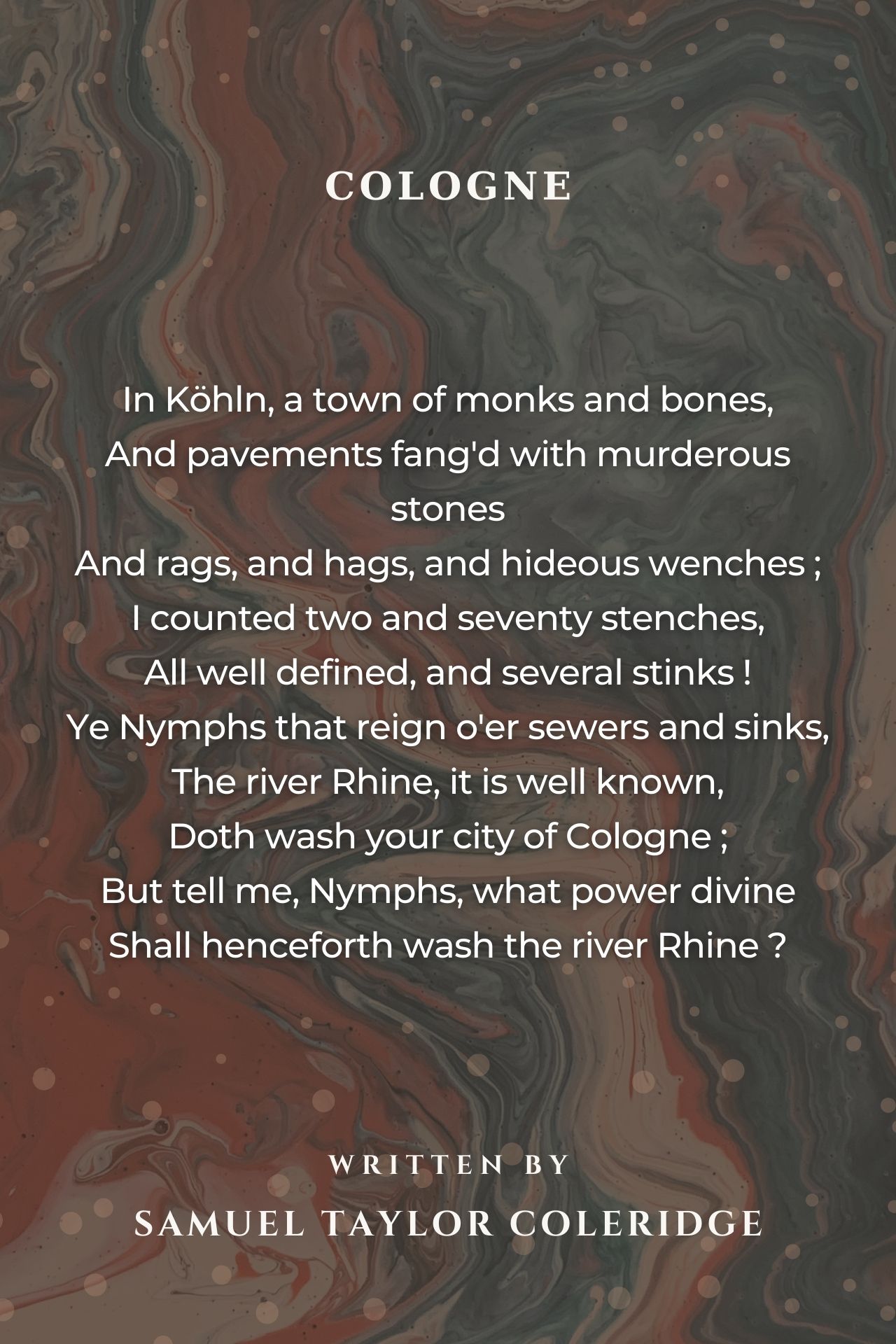 The river Rhine, it is well known, Doth wash your city of Cologne; But tell me, Nymphs, what power divine Shall henceforth wash the river Rhine? .......a captivating question to river. Beautiful poem by Samuel Taylor Coleridge is well executed.