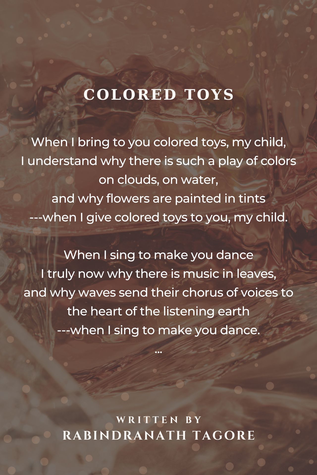 When I bring to you colored toys, my child, I understand why there is such a play of colors on clouds, on water, and why flowers are painted in tints - -when I give colored toys to you, my child. Colors and child and Tagore's imagination. tony