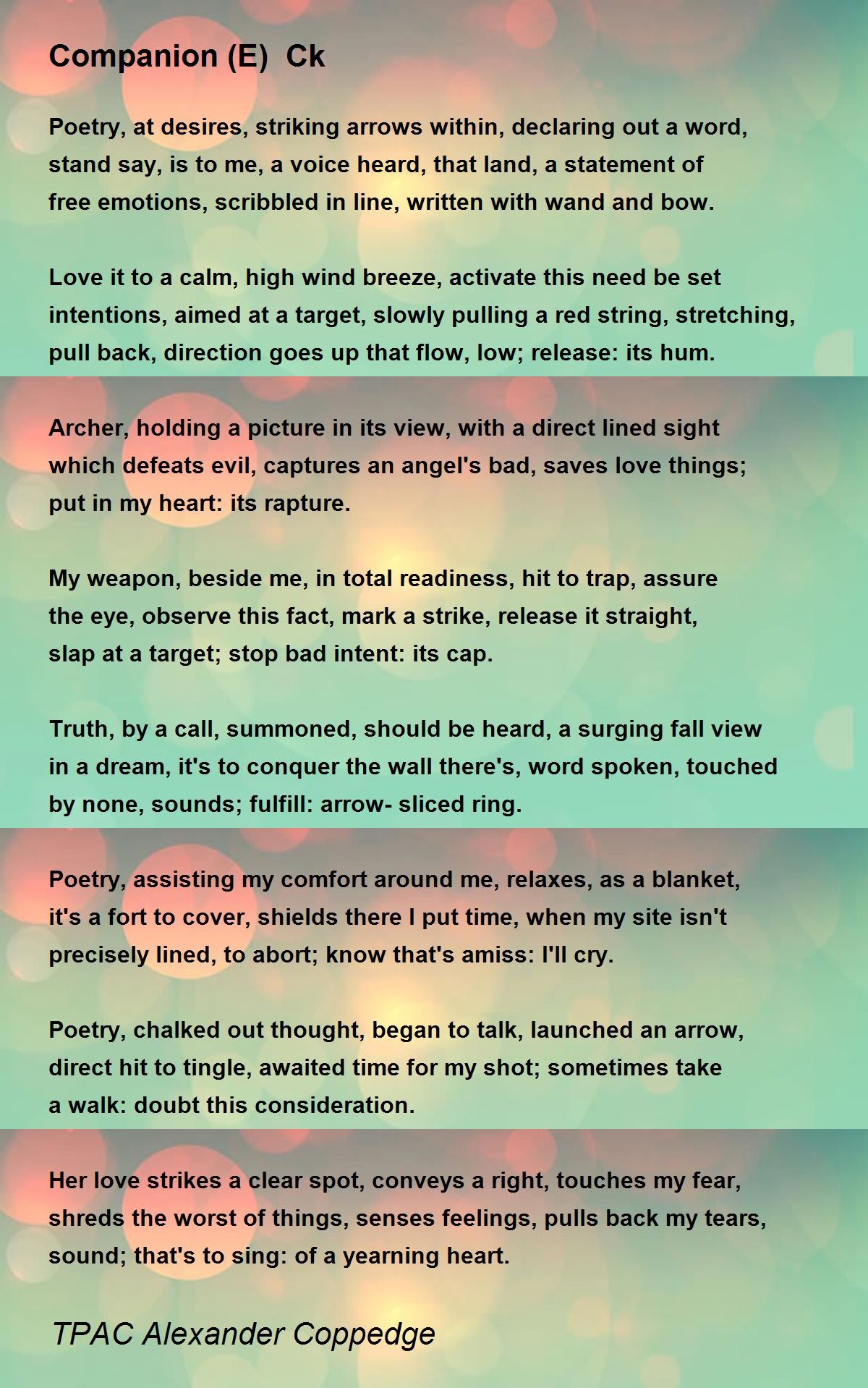Poetry, at desires, striking arrows within, declaring out a word, stand say, is to me, a voice heard, that land, a statement of free emotions, scribbled in line, written with wand and bow.
