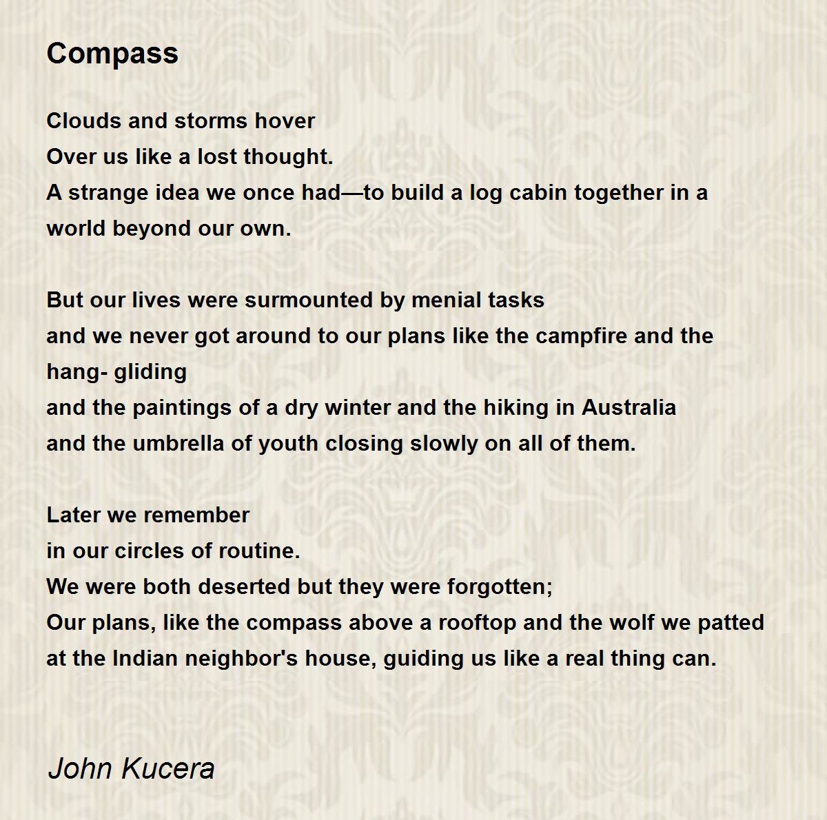 Our plans, like the compass above a rooftop and the wolf we patted at the Indian neighbor's house, guiding us like a real thing can.