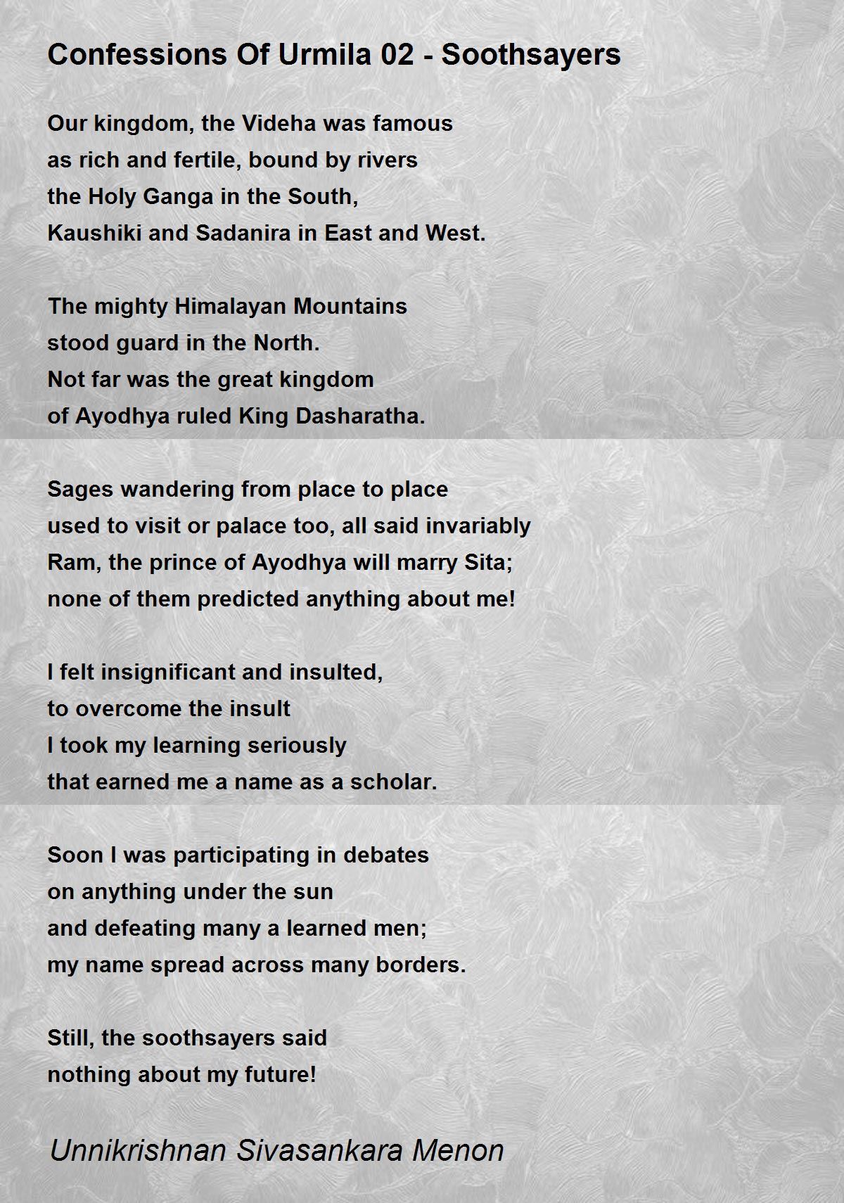 Urmila is pictured as a very learned and upright woman. In the drama Kanchana Sita by late CN Sreekanthan Nair, she powerfully questions the Maryada Purushotham Ram himself leaving him fumbling for words.