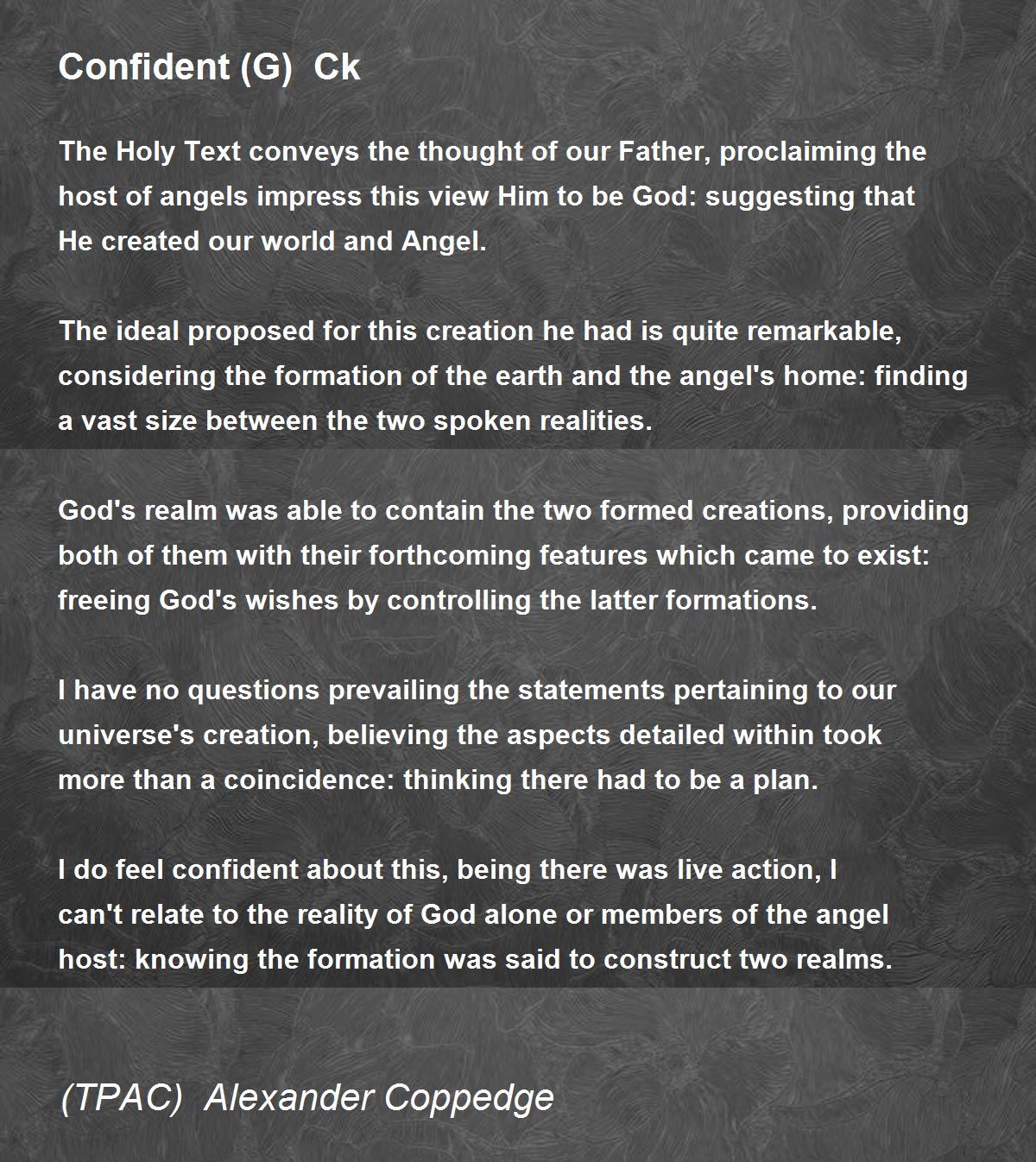 I have no questions prevailing the statements pertaining to our universe's creation, believing the aspects detailed within took more than a coincidence: thinking there had to be a plan.