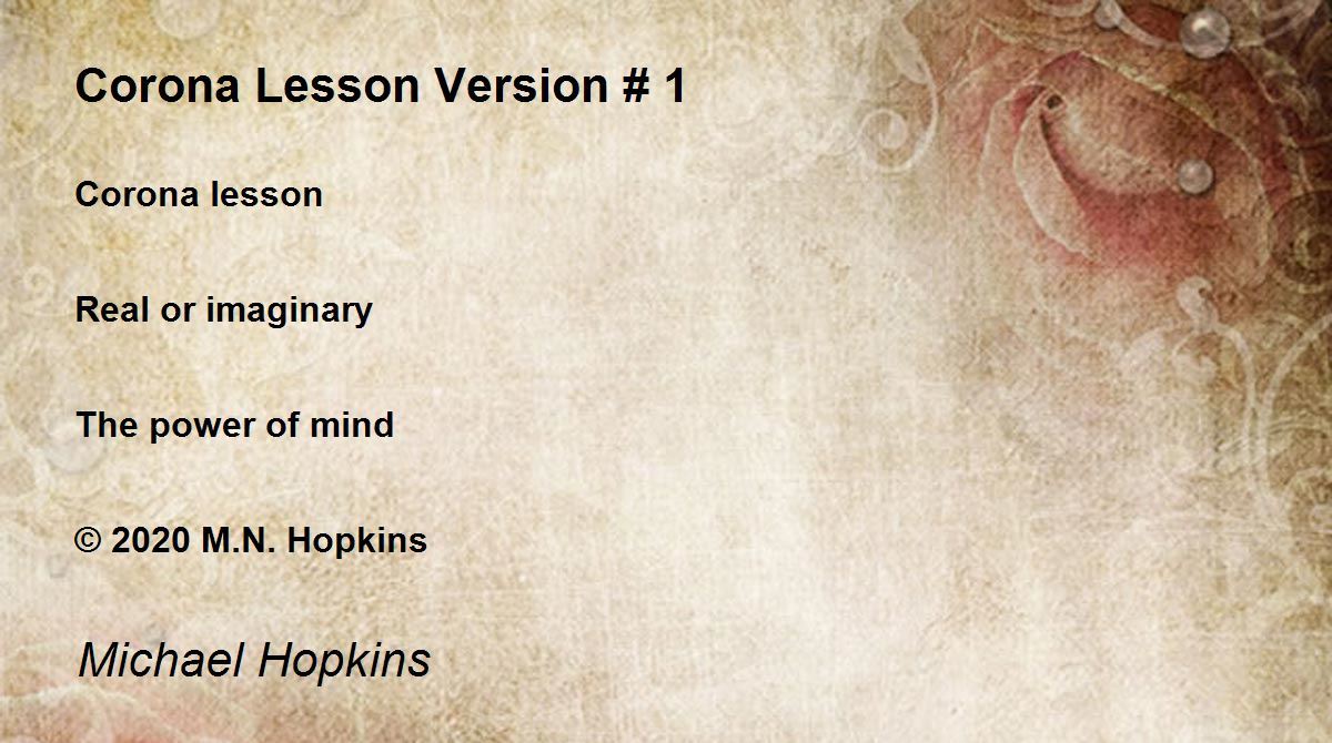 Note: I was inspired to write these nine poemsafter a short conversation with a friend. My thoughts were whether real or imaginary, the corona virus would have the same effect and just shows the creative power of the mind for either good, positive creations or the evil creations of sick, twisted minds.I also thought of the Y2K scam of 1999 when IT companies made billions from governments and corporations preparing for this terrible event caused by zeros and ones in the programs in our computers. One of the key players in this outright fraud and deception is now a key player in this pandemic scam.This time Pharma will profit along with money changes, elites and those of a very dark determination..Ponder this is you are so inclined. I may be totally wrong, I may be totally right in my assumptions. That is of no importance.What is important is the weakness of wills and minds that allow such manipulations to occur in our time.My advice if I were to give advice is to strength our bodies, minds and reconnect to the Divine from which all goodness, reason and sanity flows.