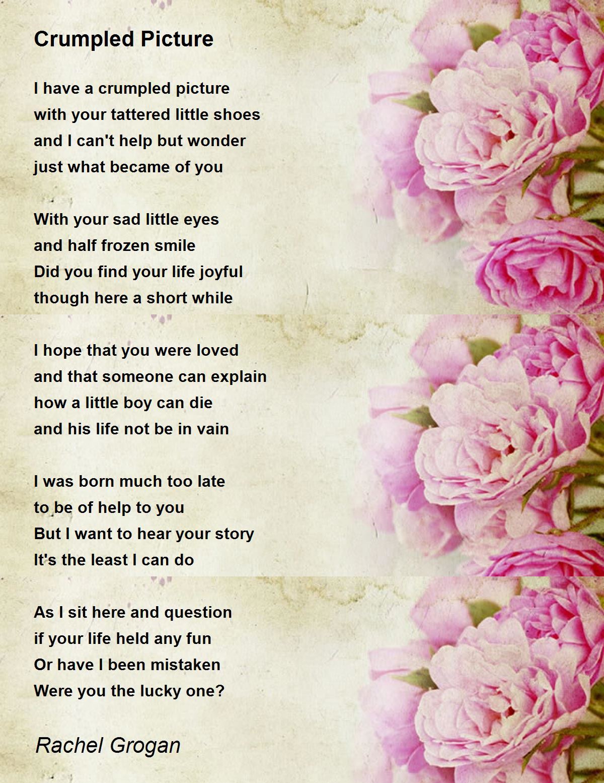 OUCH WHAT A SAD POEM AND YOUR WORDS ARE SO MOVING WE SOMETIMES WONDER WHY LIFE WOULD BE THAT SHORT FOR A LITTLE BOY I LIKE THE LINE ABOUT THE CRUMPLED PICTURE OF HIS LITTLE SHOES I SEE THEM CLEARLY THROUGH YOUR WORDS