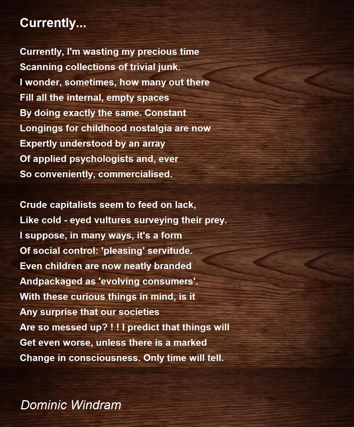 Just look at McDonalds over the years and look what they've done alone to subliminally win over parents and their children alike with tv lovely to look at expensively produced ads and not forgetting that ever smiling cute Ronald. Even an ad showing their staff litter collecting. And don't get me started on The House Of Mouse....Disney! ! Five stars Dominic and a poem that indeed food for thought....without the fries,