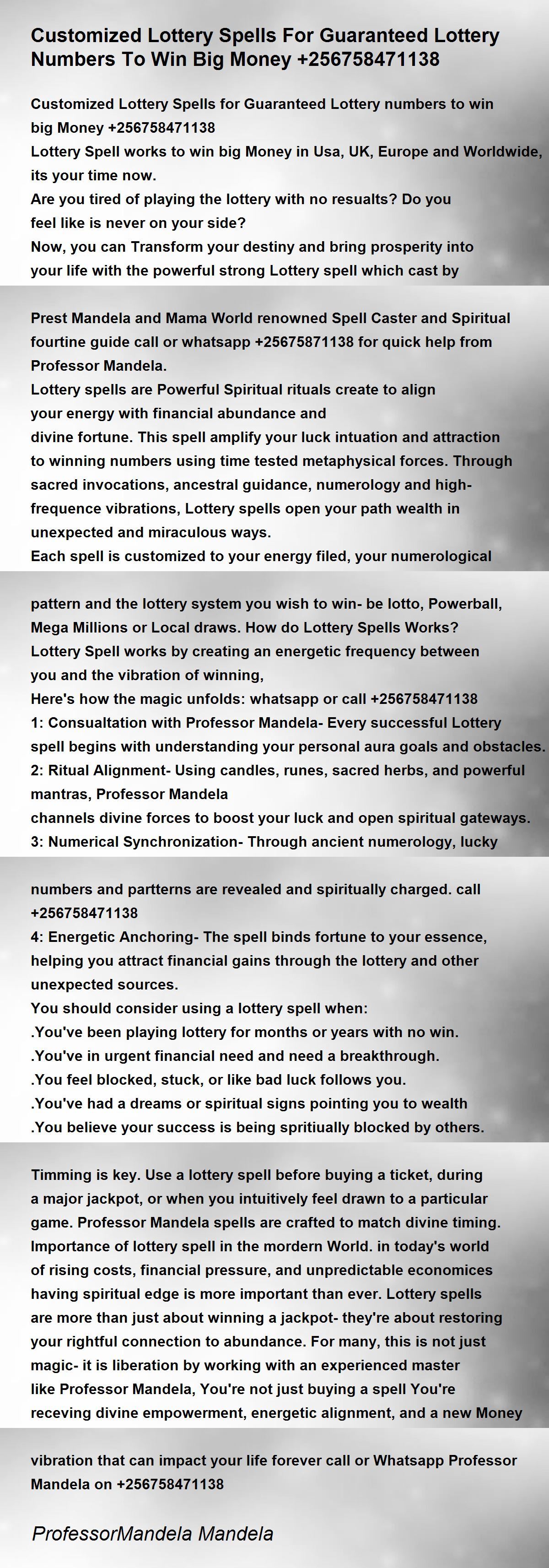 Timming is key. Use a lottery spell before buying a ticket, during a major jackpot, or when you intuitively feel drawn to a particular game. Professor Mandela spells are crafted to match divine timing. Importance of lottery spell in the mordern World. in today's world of rising costs, financial pressure, and unpredictable economices having spiritual edge is more important than ever. Lottery spells are more than just about winning a jackpot-they're about restoring your rightful connection to abundance. For many, this is not just magic- it is liberation by working with an experienced master like Professor Mandela, You're not just buying a spell You're receving divine empowerment, energetic alignment, and a new Money vibration that can impact your life forever call or Whatsapp Professor Mandela on +256758471138