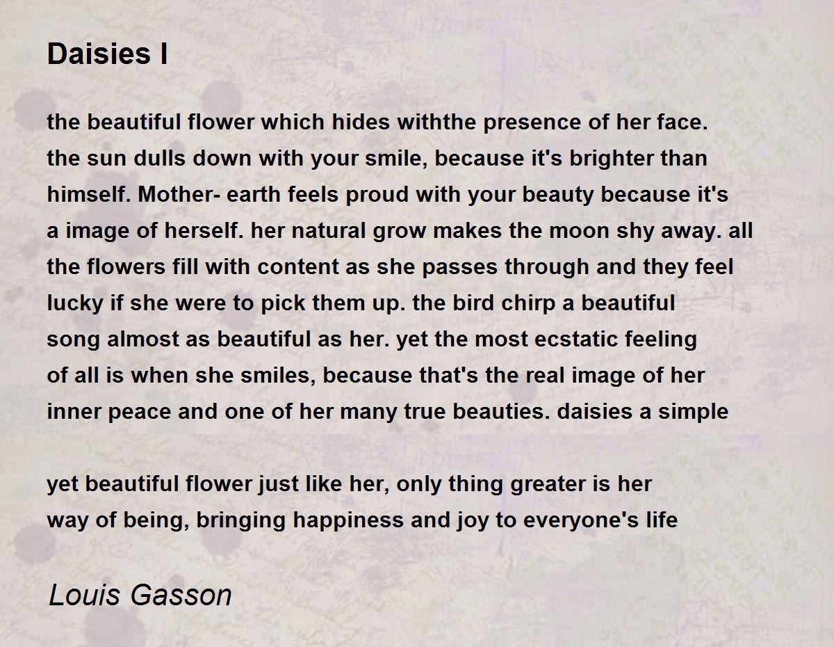 the beautiful flower which hides withthe presence of her face. the sun dulls down with your smile, because it's brighter than himself. Mother-earth feels proud with your beauty because it's a image of herself. her natural grow makes the moon shy away.all the flowers fill with content as she passes through and they feel lucky if she were to pick them up. the bird chirp a beautiful song almost as beautiful as her. yet the most ecstatic feeling of all is when she smiles, because that's the real image of her inner peace and one of her many true beauties. daisies a simple yet beautiful flower just like her, only thing greater is her way of being, bringing happiness and joy to everyone's life