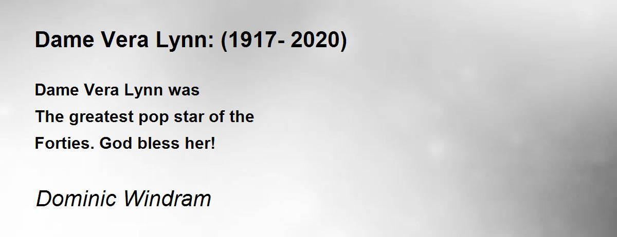 A wonderful tribute to the Force's Sweetheart. The never forgotten Vera Margaret Lynn. Thank you Dominic. 10+ for choosing not to forget this fine lady.