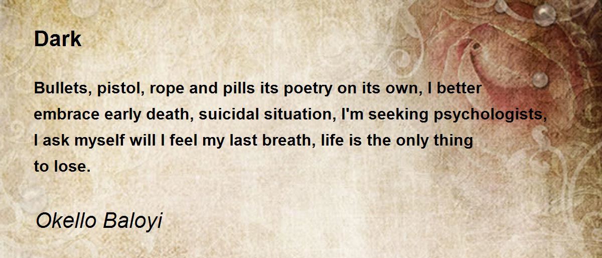 Bullets, pistol, rope and pills its poetry on its own, I better embrace early death, suicidal situation, I'm seeking psychologists, I ask myself will I feel my last breath, life is the only thing to lose.